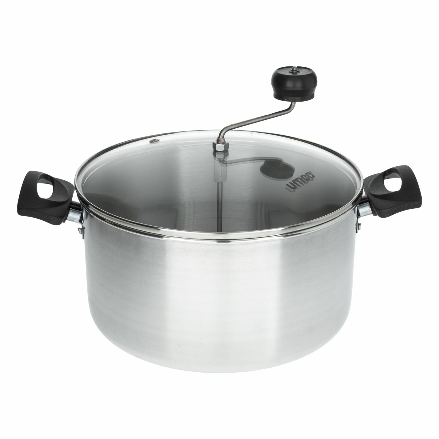 ¡Disfruta canguil crujiente y delicioso sin esfuerzo! Diámetro: 24 cm Material: Aluminio resistente Tapa de vidrio para controlar la cocción Sistema giratorio que evita que se queme el grano Ideal para canguil dulce y salado Apta para cocinas a gas, eléctricas y vitrocerámica Fácil de limpiar y usar