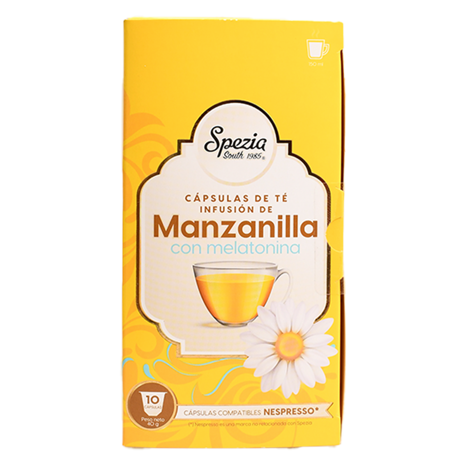 - Relájate y disfruta de un descanso reparador con las cápsulas de té de manzanilla con melatonina SPEZIA. Suave y aromático, este té ayuda a conciliar el sueño de manera natural, brindándote momentos de calma antes de dormir. Ideal para quienes buscan un ritual nocturno delicioso y relajante