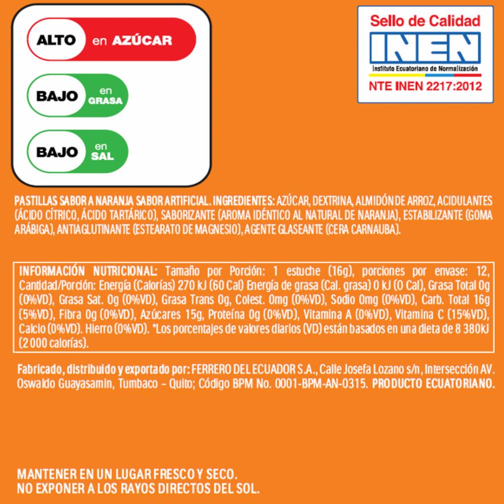 Cada caja contiene 33 pastillas sabor a naranja, con un peso de 16 gramos