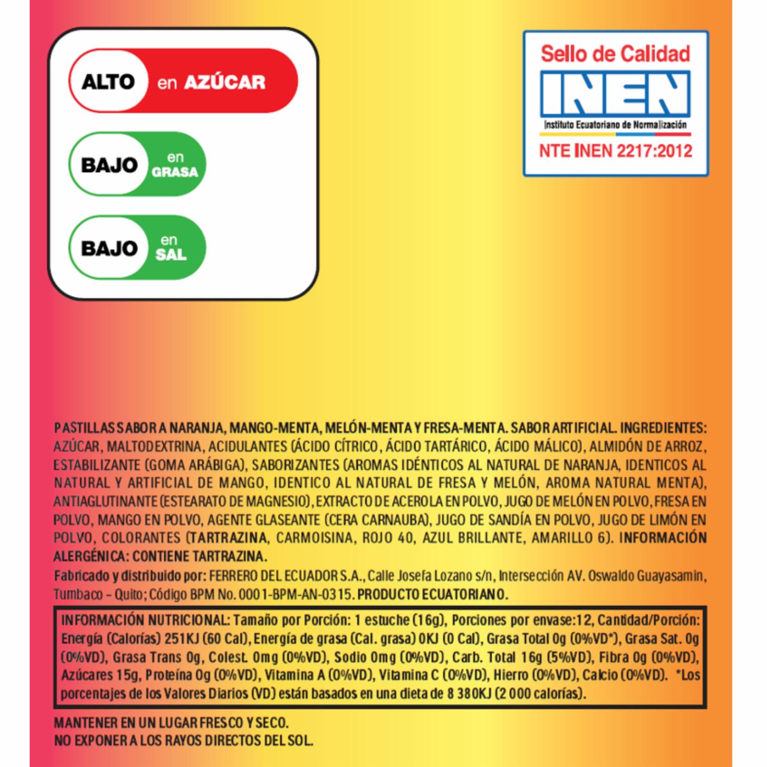 - Cada caja contiene 33 pastillas sabor a naranja, mango-menta, melon-menta y fresca menta, con un peso de 16 gramos