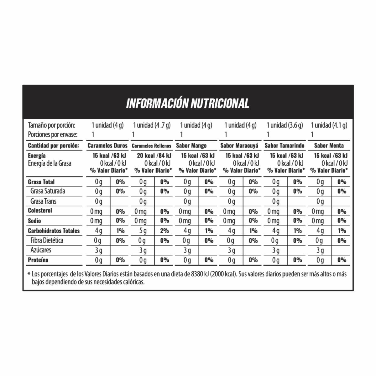 - Caramelos duros surtidos sabor a: fresa, limón, mandarina, uva, salpicón, maracuya, mango, naranja