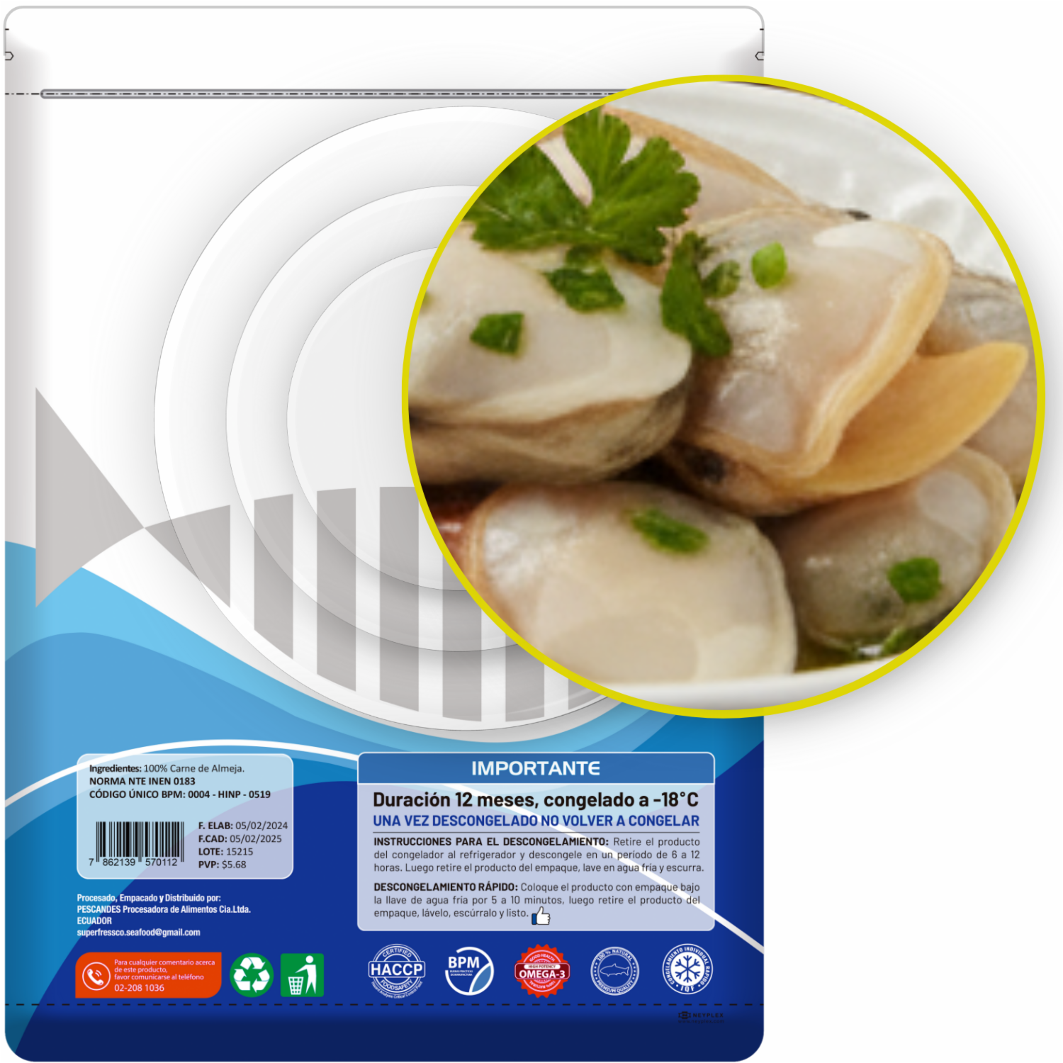 - Contiene almejas sin concha congeladas IQF. Listos para cocinar y servir