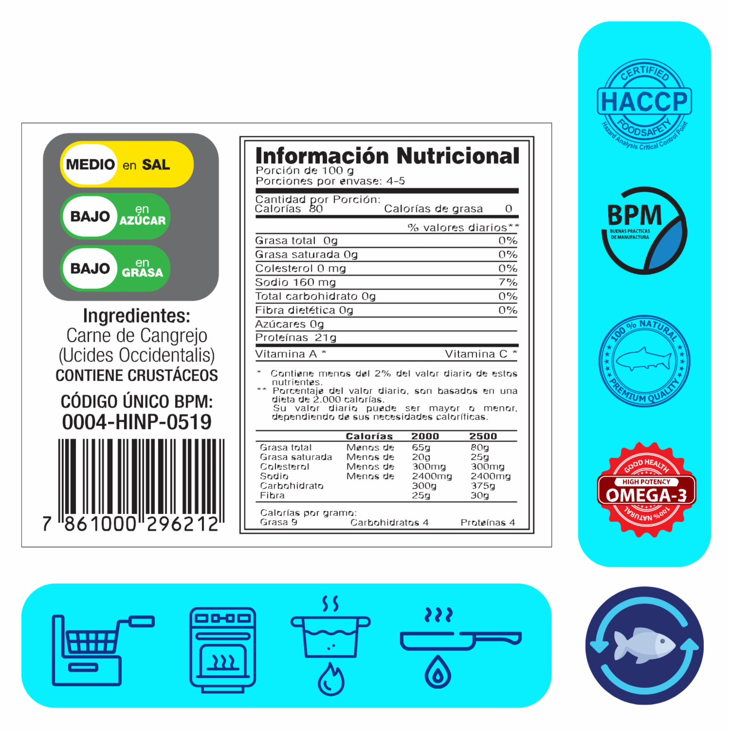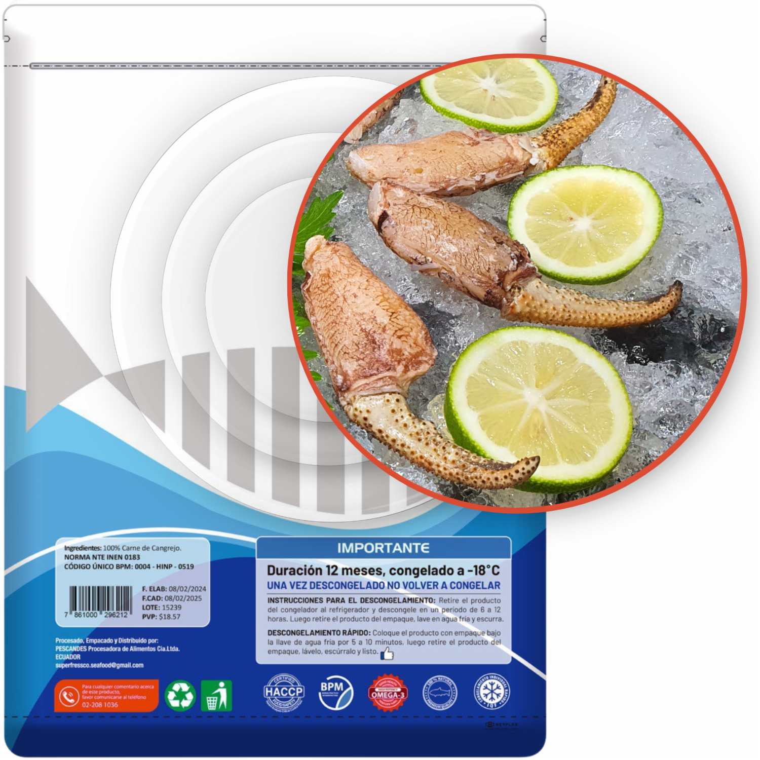 - Contiene pulpa y 4 uñas de cangrejo congeladas IQF. Listos para cocinar y servir