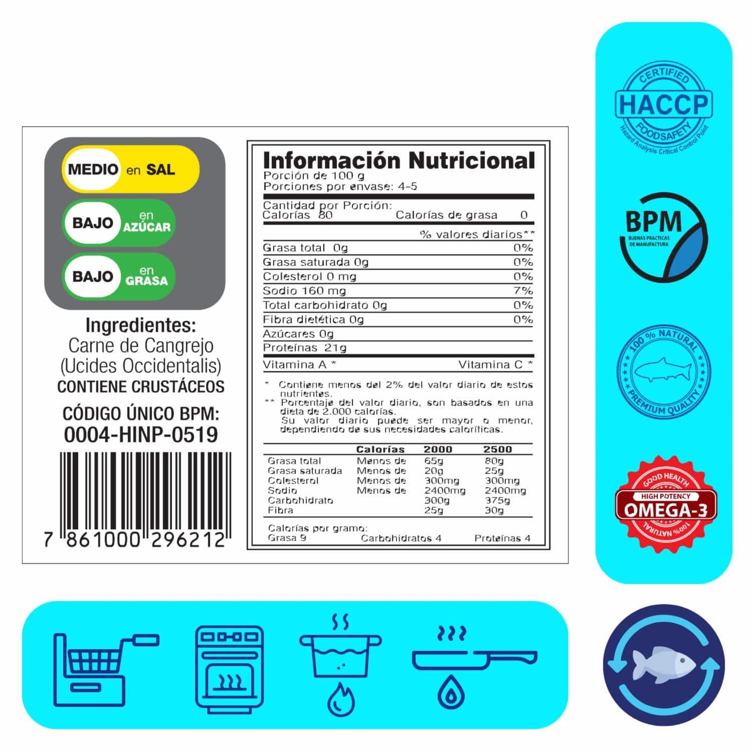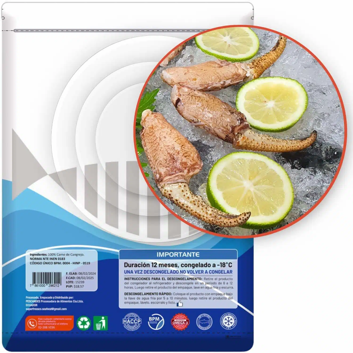 Contiene pulpa y 4 uñas de cangrejo congeladas IQF. Listos para cocinar y servir