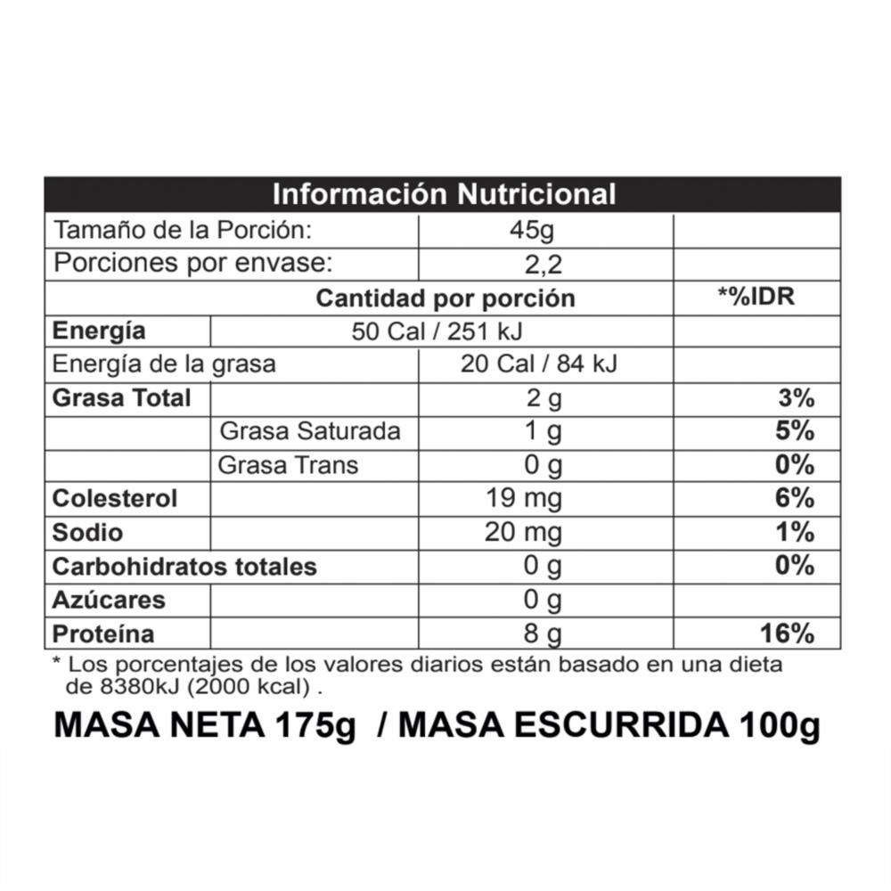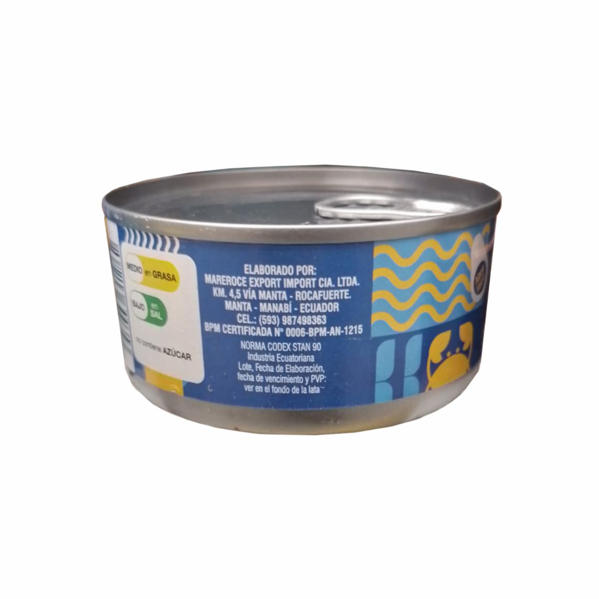 Carne de cangrejo MANGLAR esta elaborado con carne de cangrejo cocida, agua y sal. Masa neta 175 g / Masa escurrida 100 g . CONTIENE CRUSTACEOS, se debe conservar en una ambiente, fresco y seco. Una vez abierto cambiar envase y refrigerar