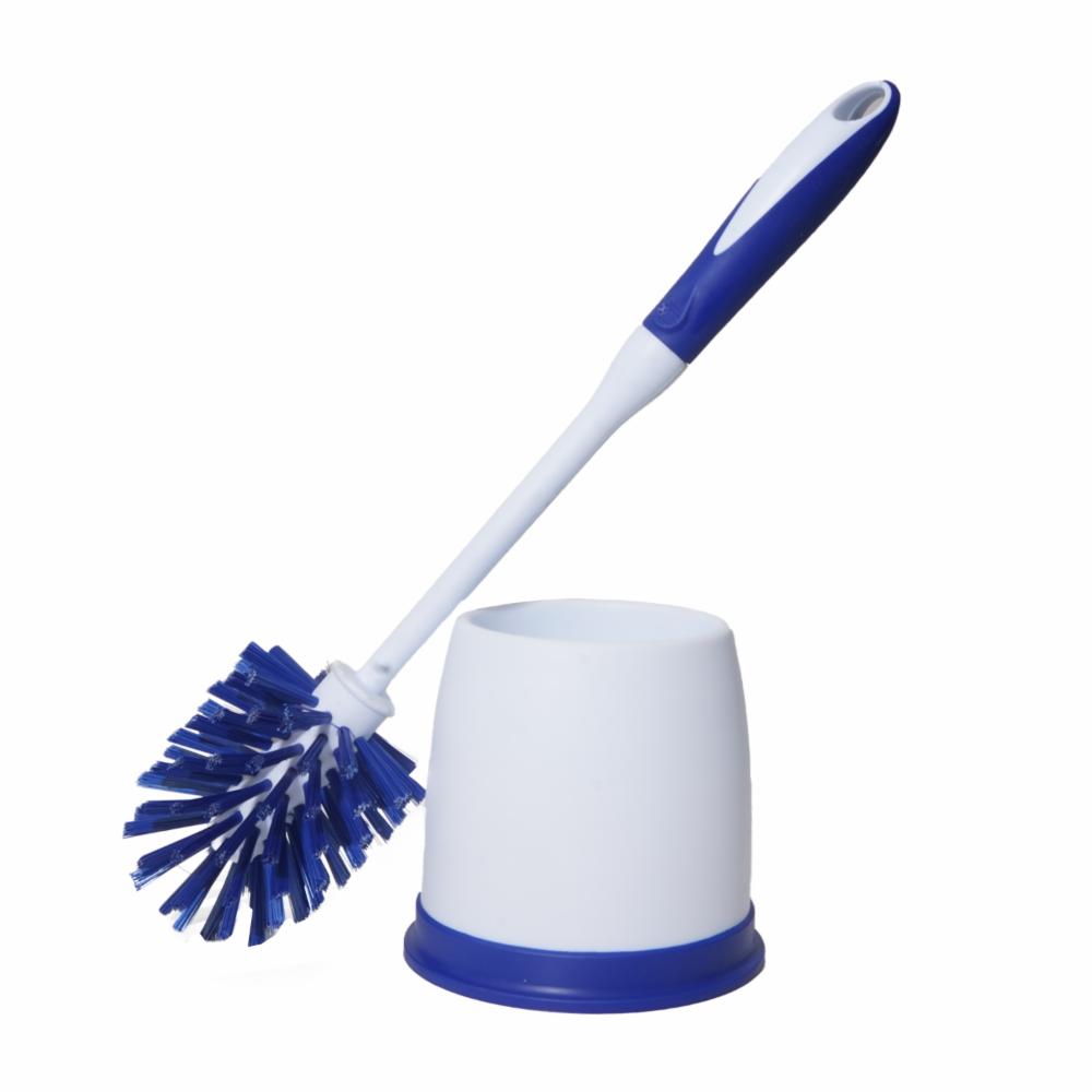 Cepillo para limpiar la taza del inodoro de Lustre, con cerdas resistentes y durables. Tiene un práctico recipiente que mantiene la escobilla sin contacto con el piso