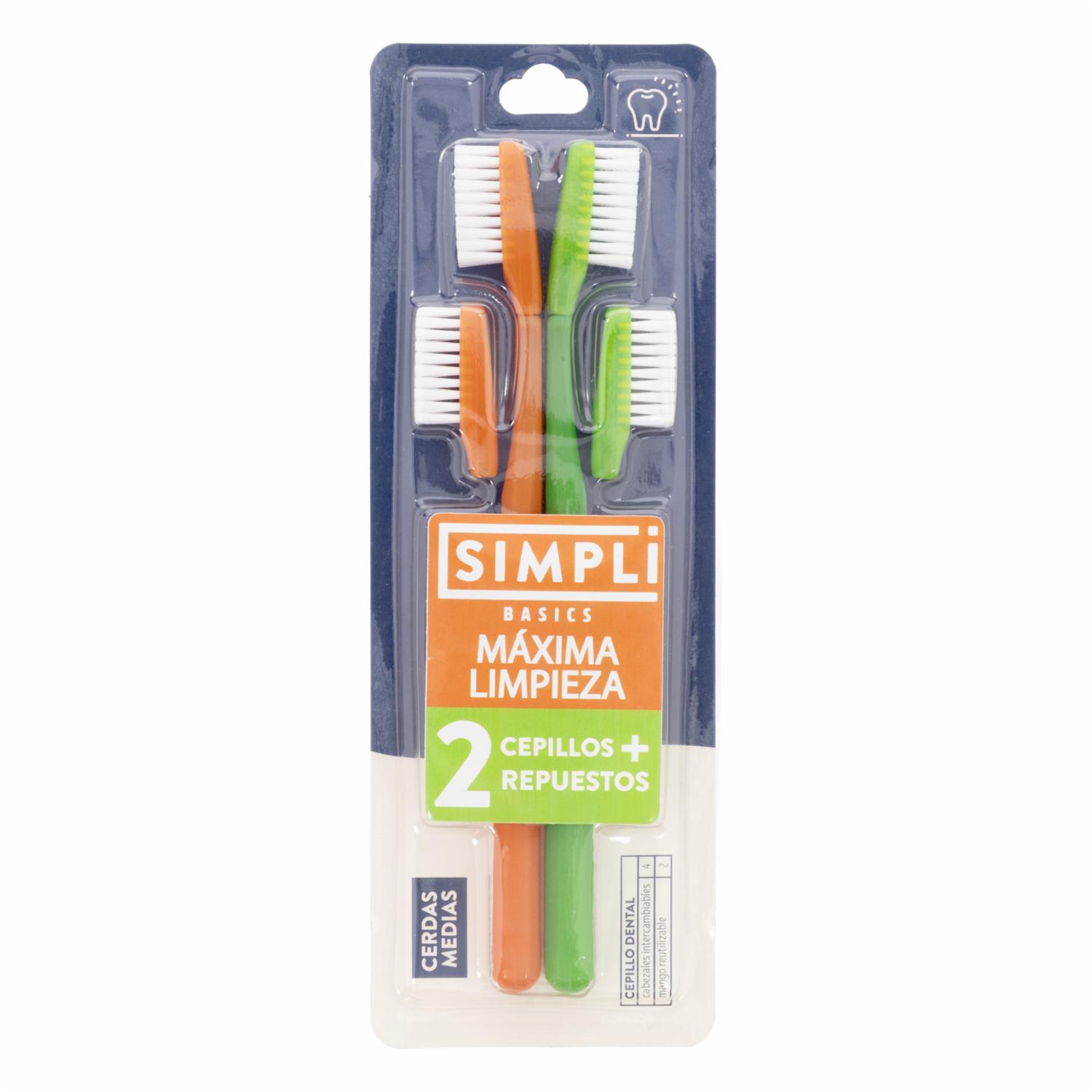 - Mantén una higiene bucal completa con el cepillo dental Simpli de cerdas medias para máxima limpieza. Su diseño ergonómico facilita el cepillado diario, mientras que incluye dos repuestos para mayor durabilidad y conveniencia. Ideal para cuidar tu sonrisa con eficacia y comodidad