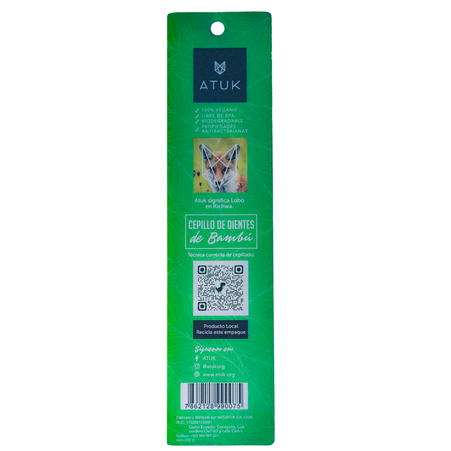 El cepillo dental Atuk, elaborado en bambú y equipado con cerdas de carbón activado, ofrece una limpieza profunda y suave al mismo tiempo. Protege tus encías, cuida el esmalte y brinda una sensación de frescura natural en cada cepillado. Sus cerdas, con la firmeza recomendada por especialistas, garantizan una higiene oral efectiva y segura