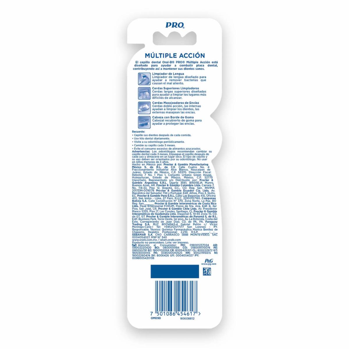 - El Cepillo Pro Multipleacción Tiene Cerdas 40 Medio Y Un Limpiador De Lengua Diseñado Para Ayudar A Remover Esas Bacterias Que Causan El Mal Aliento