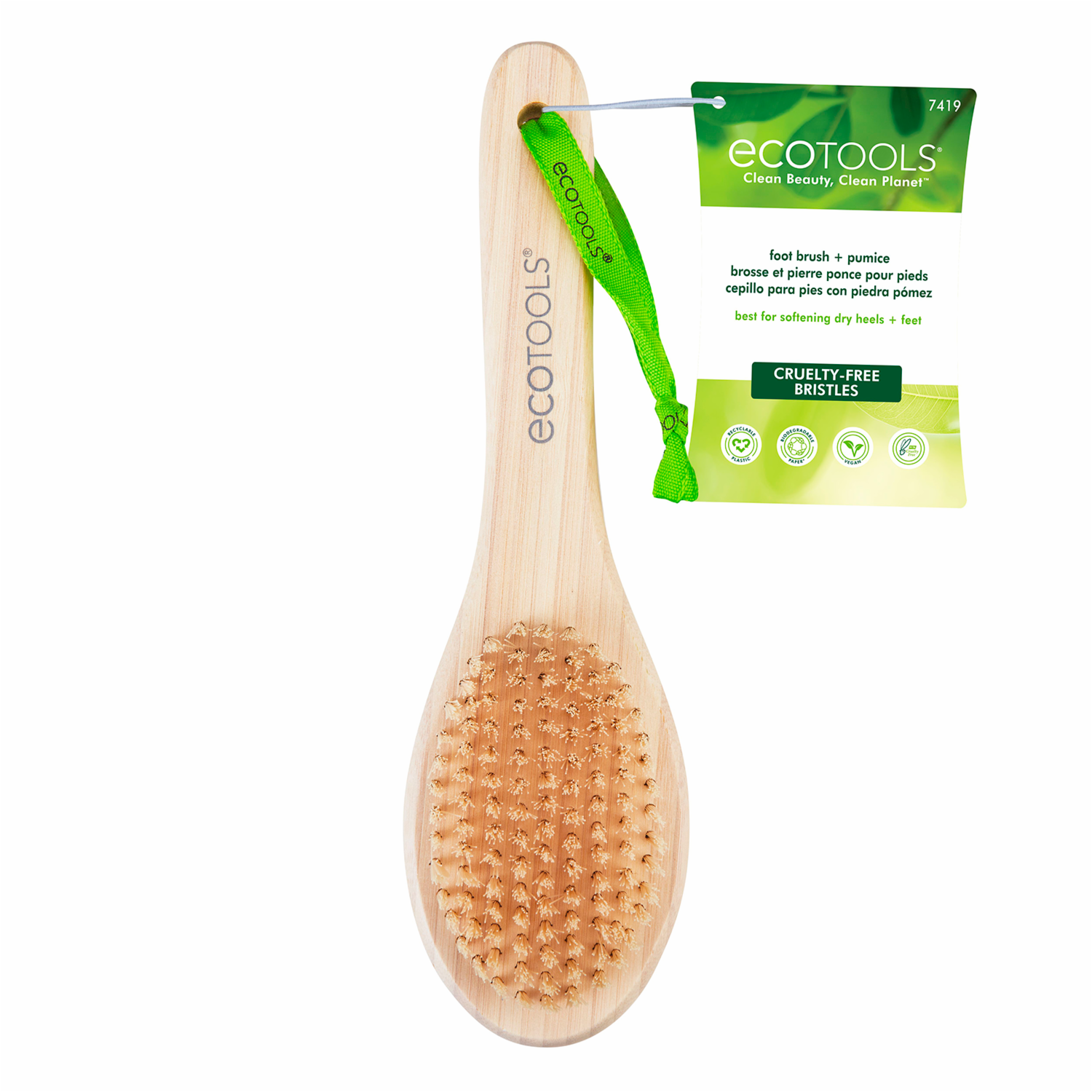 - Este cepillo para pies y piedra pómez está diseñado con un mango de bambú, cerdas sintéticas libres de crueldad animal y piedra pómez para limpiar y exfoliar profundamente los pies secos. Tiene una cinta para colgarlo. Nuestros productos son 100 % veganos y nunca han sido probados en animales, por lo que también son libres de crueldad animal