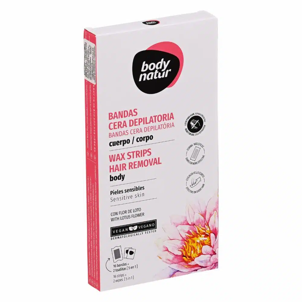 Cera Depilatoria Corporal En Bandas Piel Sensible Con Flor De Loto BODY NATUR 16 Uds