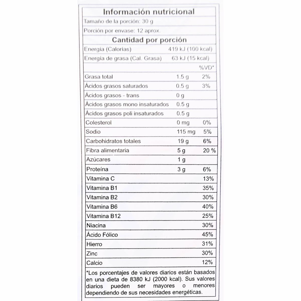 - Bajo contenido de azúcar. - Fuente de fibra alimentaria. - Contiene proteínas. - Enriquecido con vitaminas y minerales