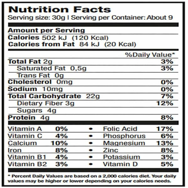 - Es un cereal hecho a base de quinoa, lo que lo hace rico en proteínas y fibra. - Contiene un sabor cítrico natural gracias a la adición de limón y naranja deshidratados. - Es libre de gluten, por lo que es apto para personas con intolerancia al gluten o enfermedad celíaca. - No contiene conservantes ni colorantes artificiales. - Es una opción saludable y nutritiva para el desayuno o como snack durante el día