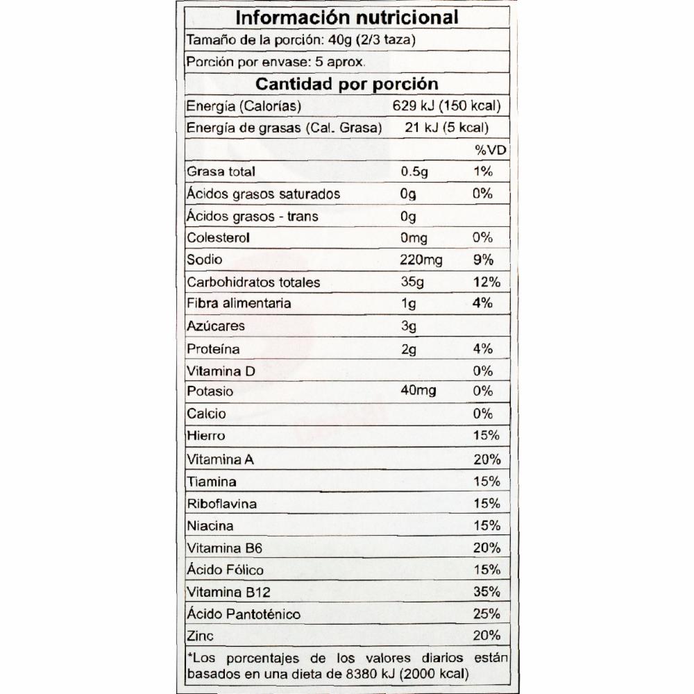 - El cereal está hecho principalmente de maíz. - Es una fuente de carbohidratos y fibra. - Contiene vitaminas y minerales como el hierro y el calcio. - Es bajo en grasas saturadas y colesterol. - Viene en diferentes presentaciones y sabores para adaptarse a los gustos de cada persona