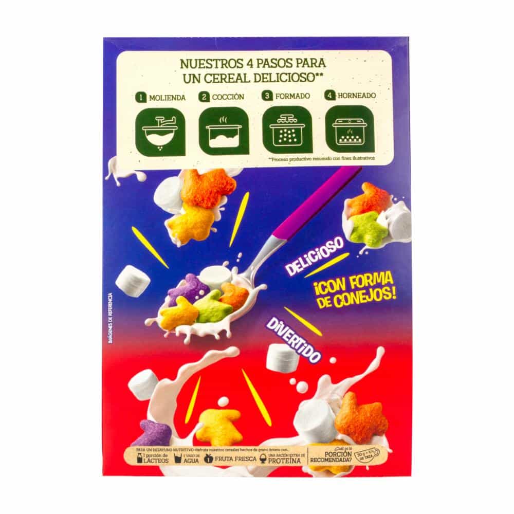 • Cereal de maíz integral y maíz sabor a frutas con malvaviscos con forma de conejitos