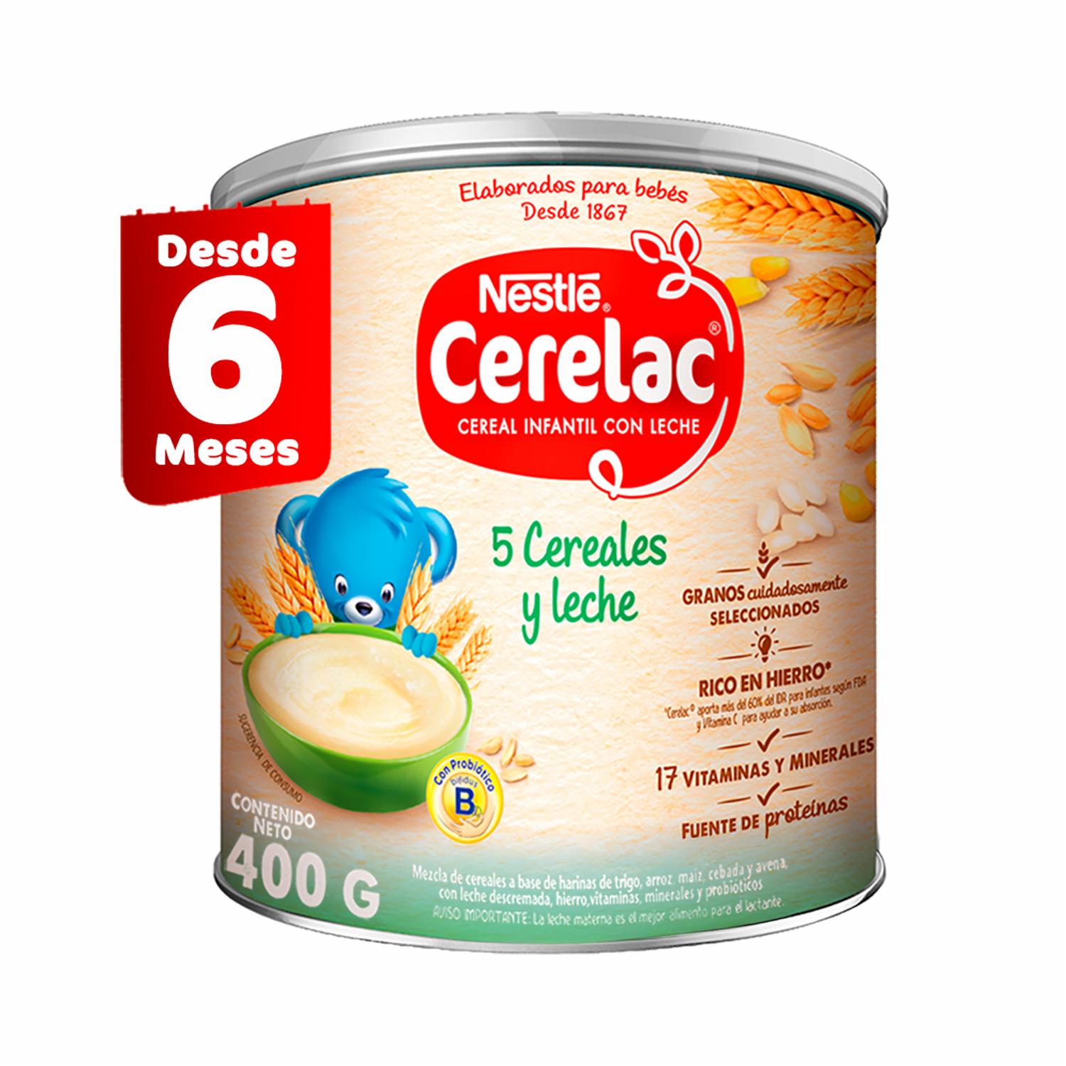 - Nestlé Cerelac®, cereal con leche, trigo, arroz, maíz, cebada y avena para niños a partir de 1 año de edad. Contiene hierro y probióticos que ayudan a fortalecer las defensas naturales del niño