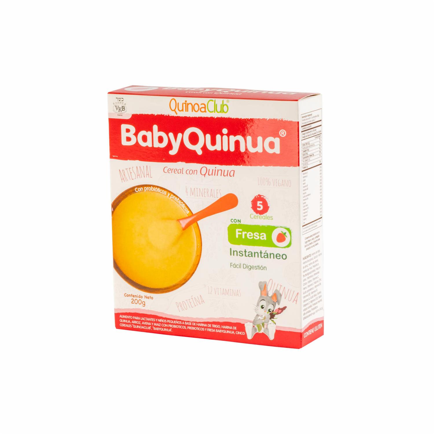 - - Es un cereal infantil hecho a base de quinoa y saborizado con fresa. - Es rico en proteínas, vitaminas y minerales esenciales para el crecimiento y desarrollo del bebé. - No contiene gluten ni lactosa, por lo que es apto para bebés con intolerancias o alergias alimentarias. - Es fácil de preparar y se puede mezclar con leche materna, fórmula o agua. - Viene en un envase práctico y seguro para su almacenamiento y transporte