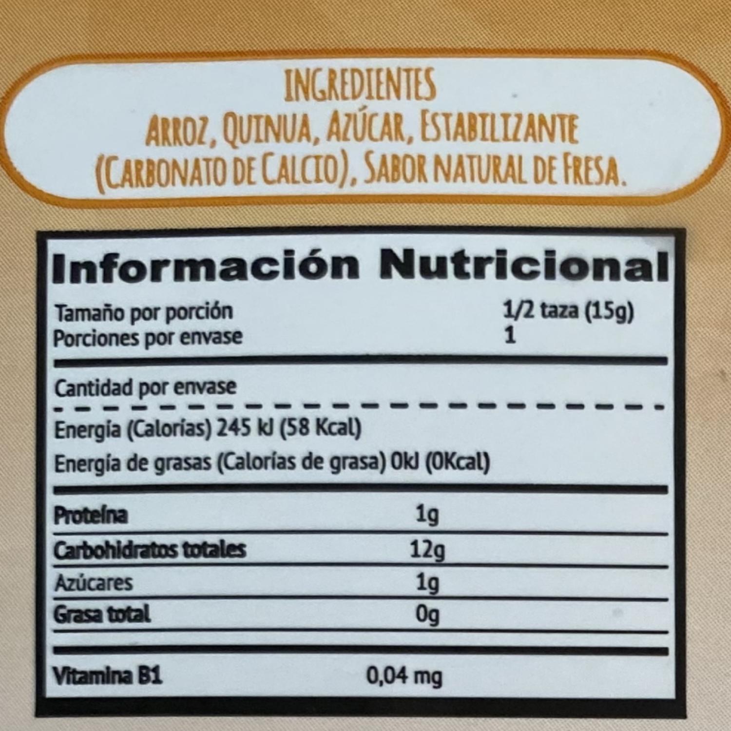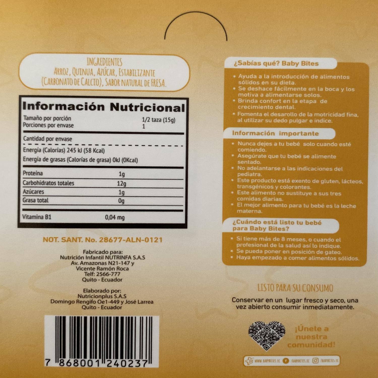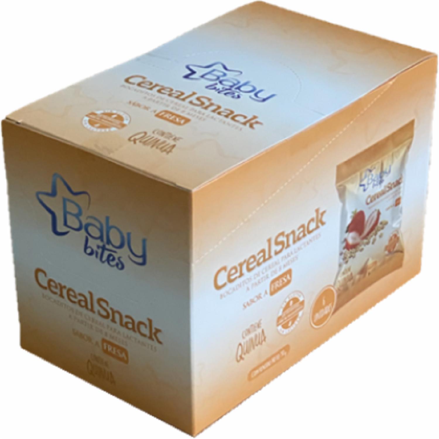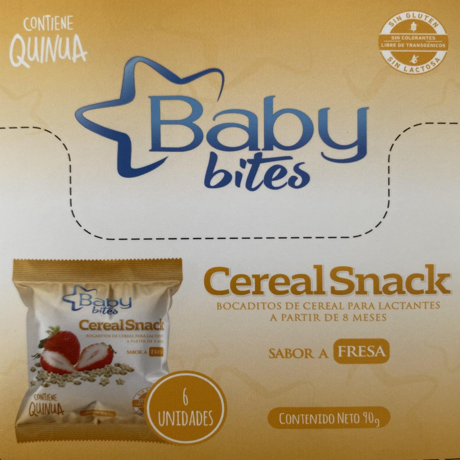 - El "cereal Snack Sabor A Fresa Baby Bites 15 G" Es Un Extruido De Arroz Y Quinua, Direccionado Para Bebés O Niños Pequeños, Elaborado Por La Marca Baby Bites. Este Tipo De Cereal Fue Desarrollado Para Ser Una Opción De Alimento Sólido Adecuado Para La Introducción De La Alimentación Complementaria En Bebés