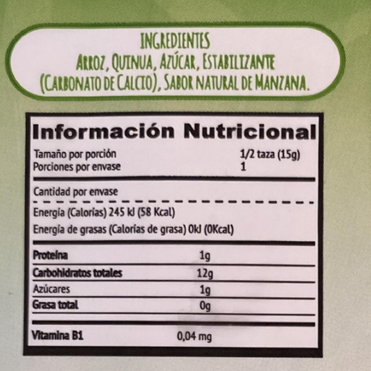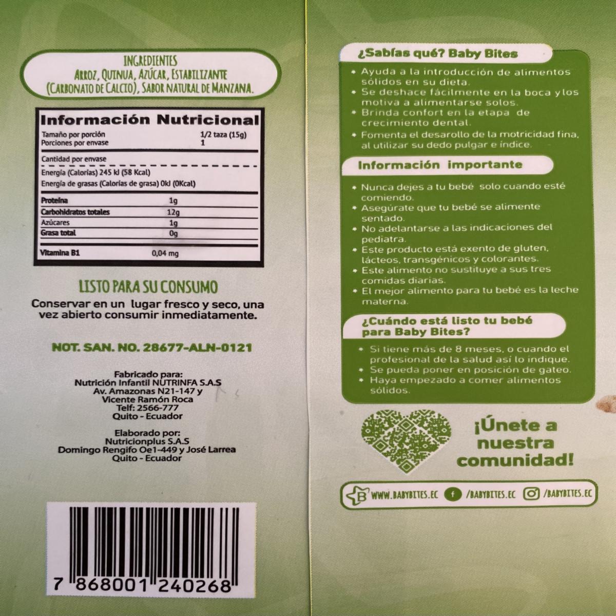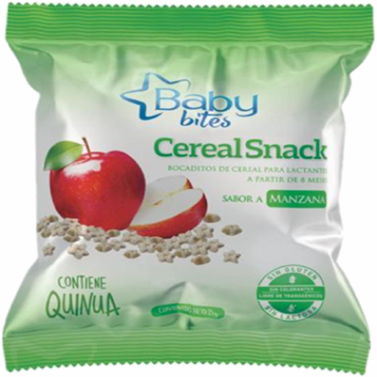 - El "cereal Snack Con Manzana Baby Bites 15 G" Es Un Extruido De Arroz Y Quinua, Direccionado Para Bebés O Niños Pequeños, Elaborado Por La Marca Baby Bites. Este Tipo De Cereal Fue Desarrollado Para Ser Una Opción De Alimento Sólido Adecuado Para La Introducción De La Alimentación Complementaria En Bebés