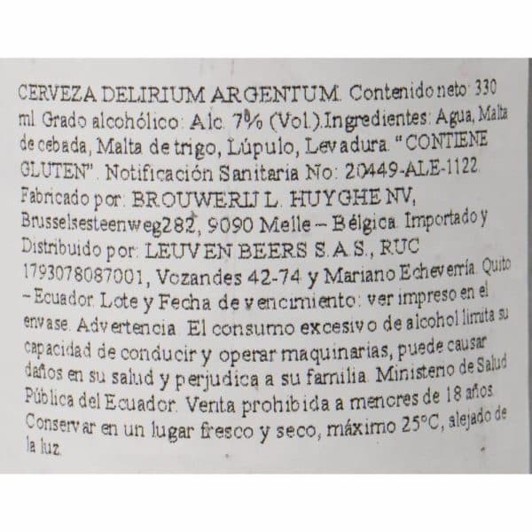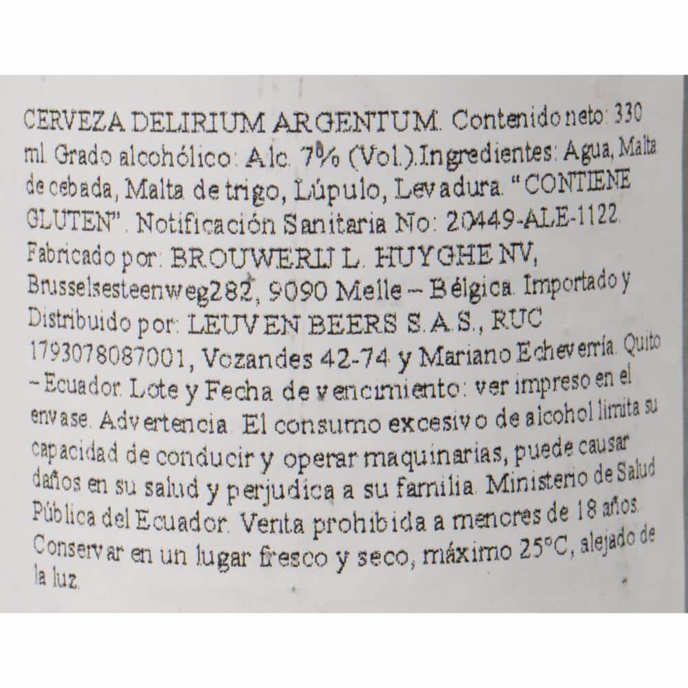 Disfruta la frescura y el carácter especial de la cerveza Argentum DELIRIUM, una bebida que combina notas suaves y equilibradas con un ligero toque afrutado. Perfecta para acompañar una buena conversación o para maridar con tus platos favoritos. Su presentación de 330 ml es ideal para que la disfrutes en cualquier ocasión, llevando la calidad y tradición cervecera directamente a tu paladar