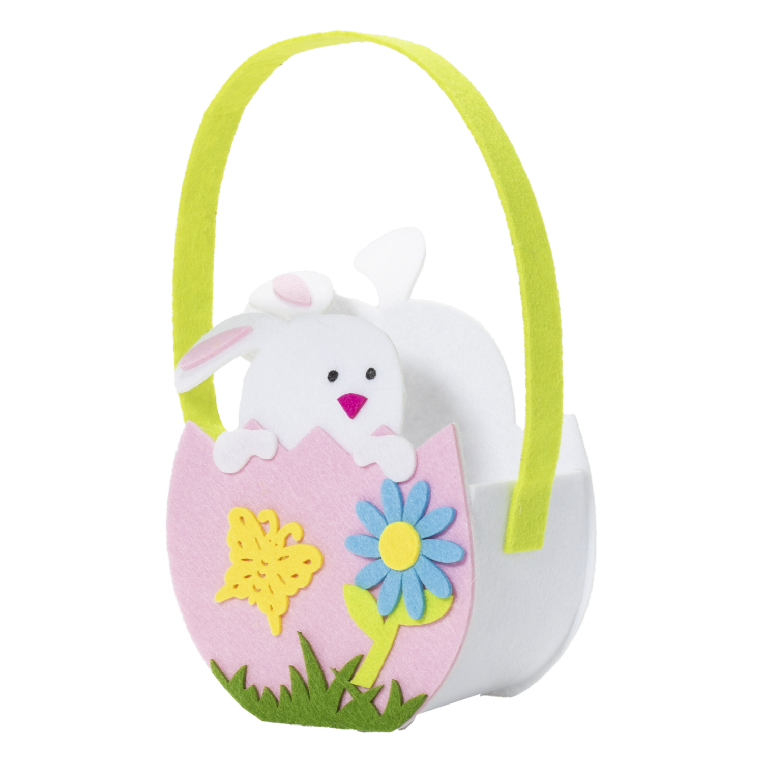 - Cesta de Pascua con diseño de conejito, ideal para rellenar con dulces, chocolates o pequeños regalos durante las celebraciones. Fabricada en fieltro y con asa para facilitar su transporte, aporta un toque decorativo y festivo