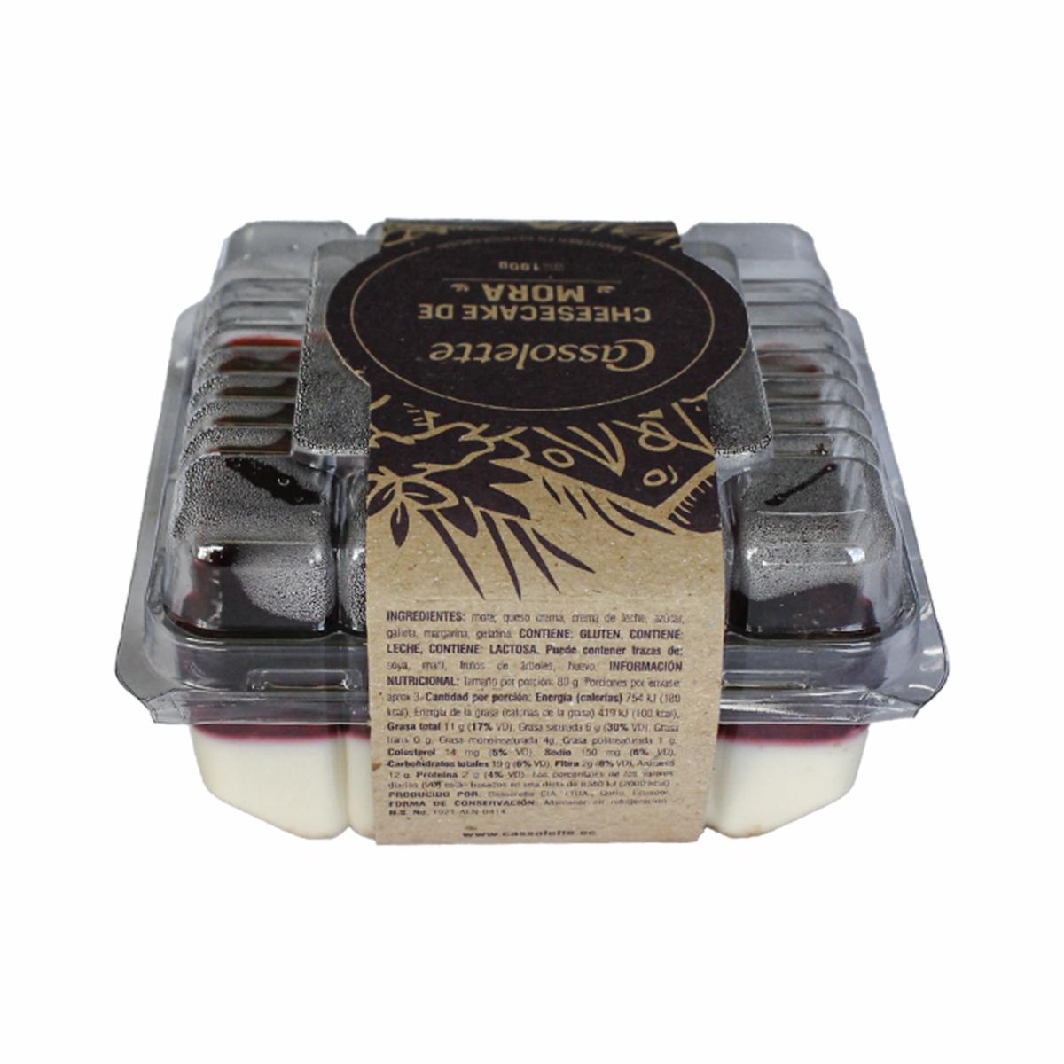 - Elaborado con base de galleta, relleno de queso crema, gelatina y azúcar, cubierta de jalea con trozos de mora