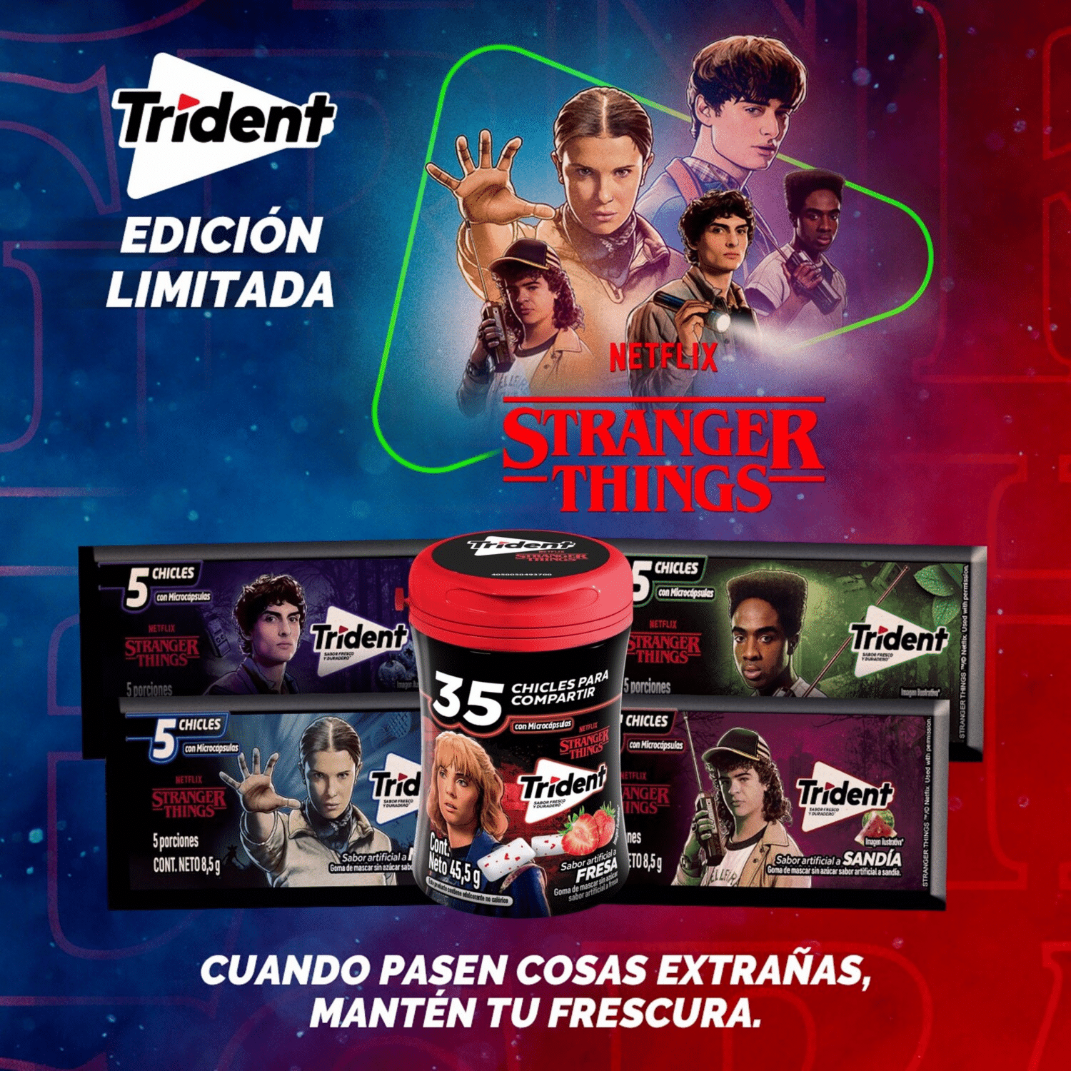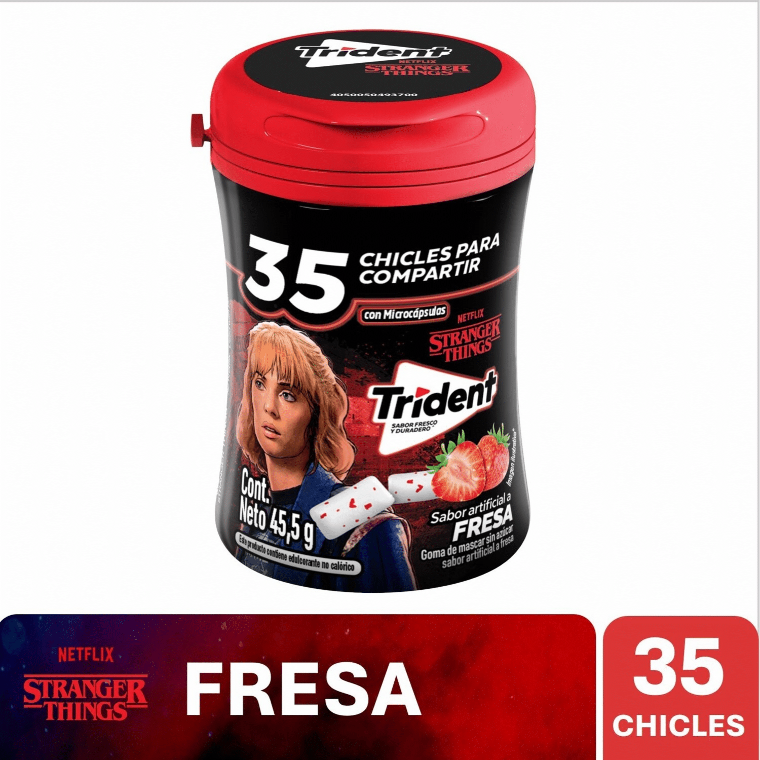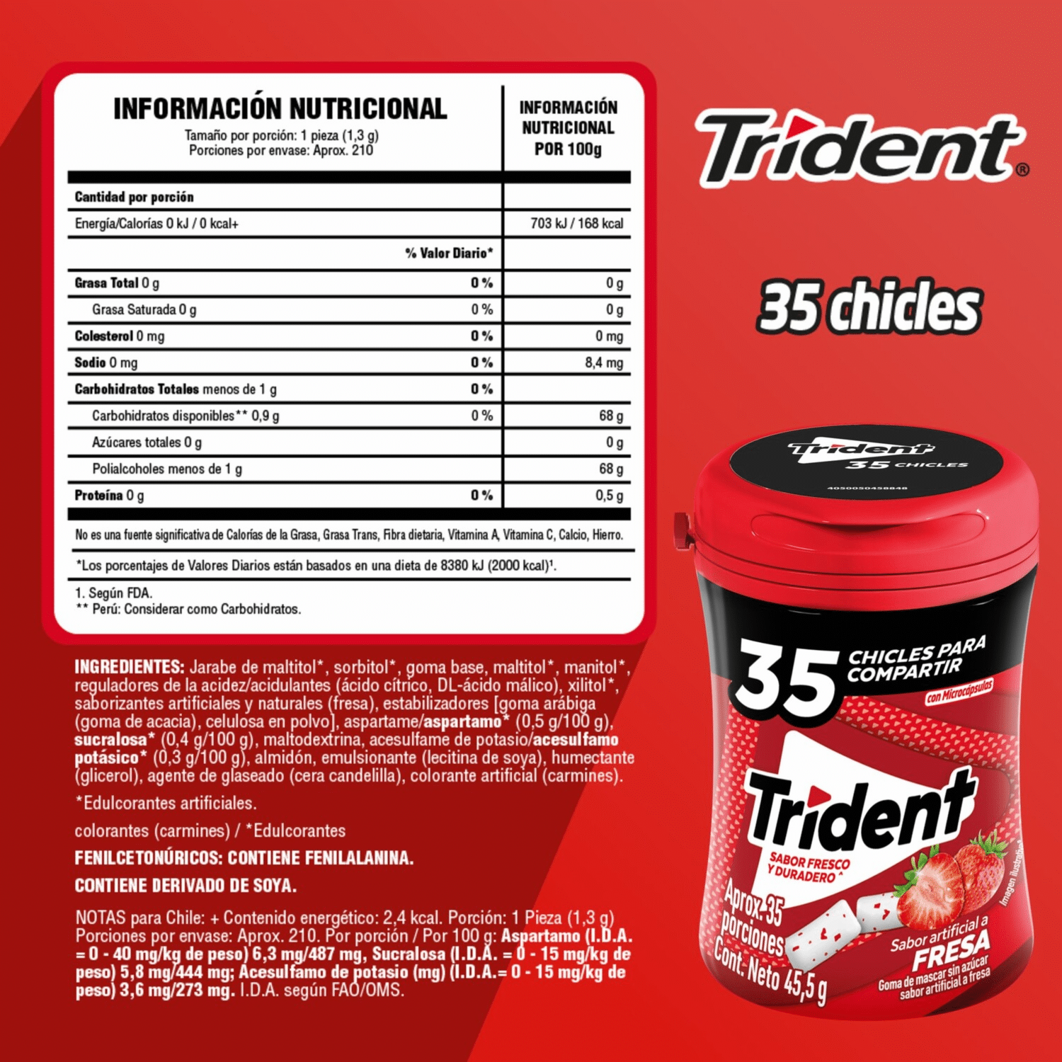 Botella Trident sabor a Fresa, 35 chicles con microcápsulas de sabor intenso y refrescante para compartir a donde vayas. Ideal para llevar en el bolso, carro y compartir con tus amigos.