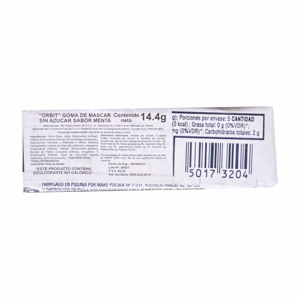 Chicle De Menta Sin Azúcar ORBIT 14 G