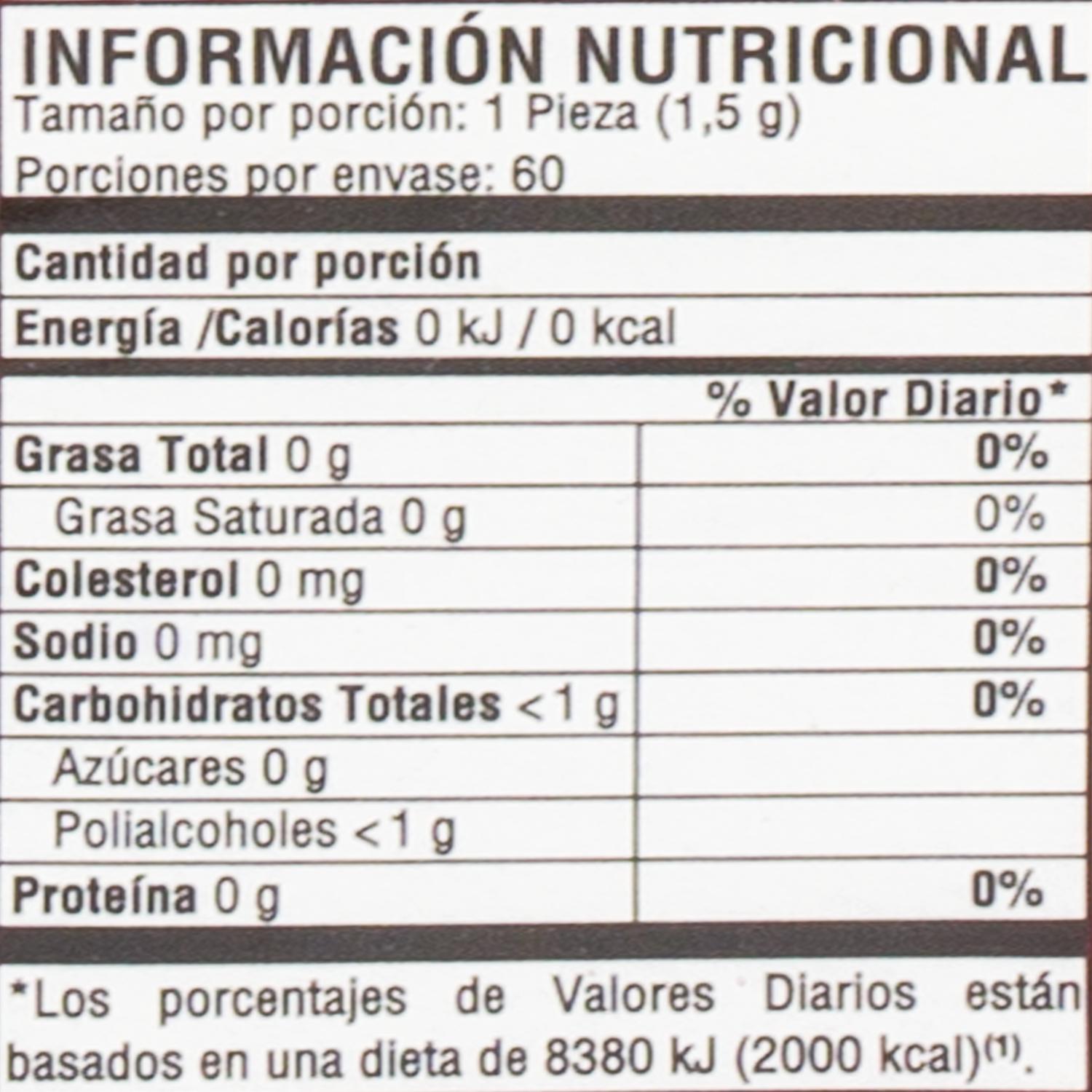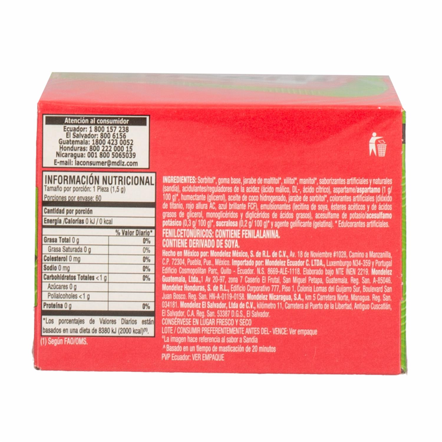 - Chicles con sabor a Sandía, caja x 60 unidades x 1,5g c/u con microcápsulas de sabor dulce, intenso y duradero. Un formato conveniente para llevar a todas partes para que refresques tus días