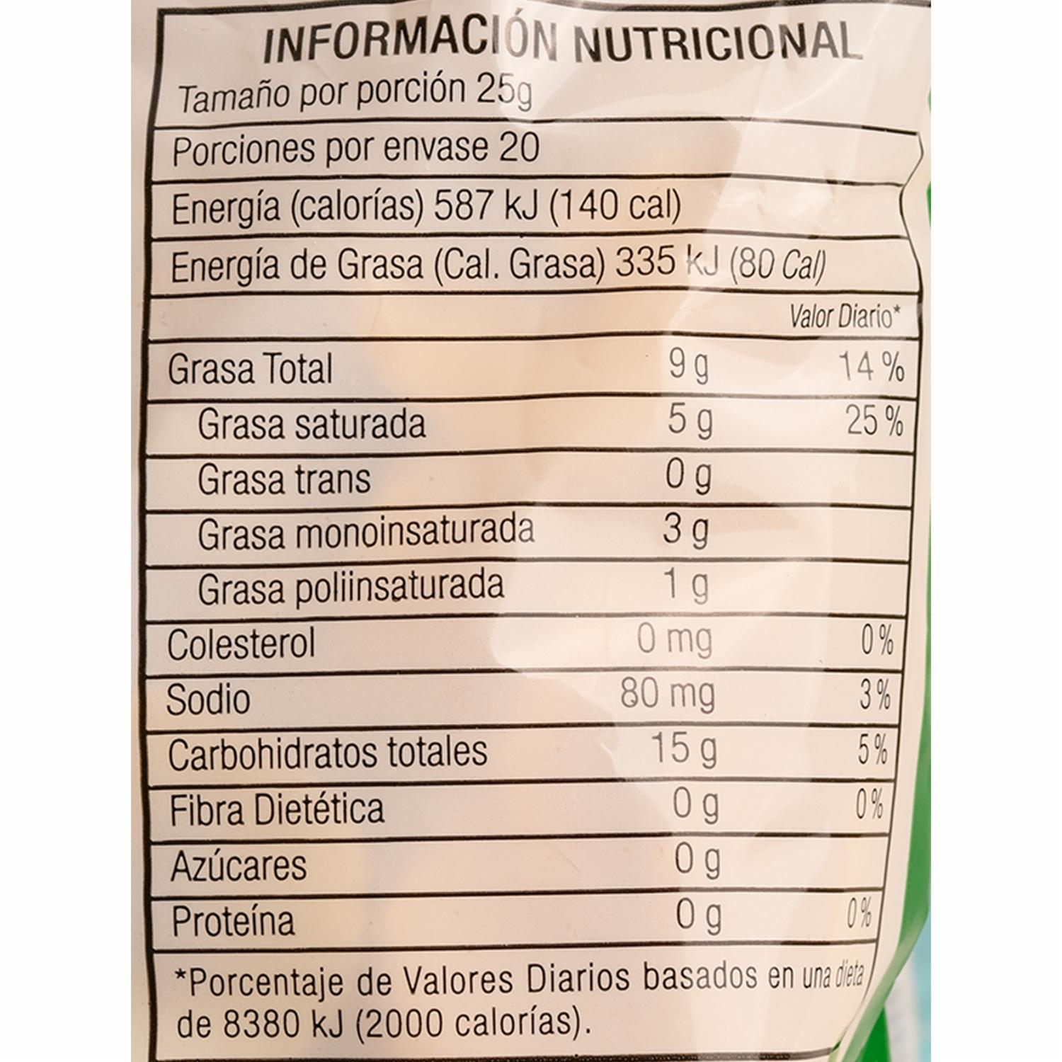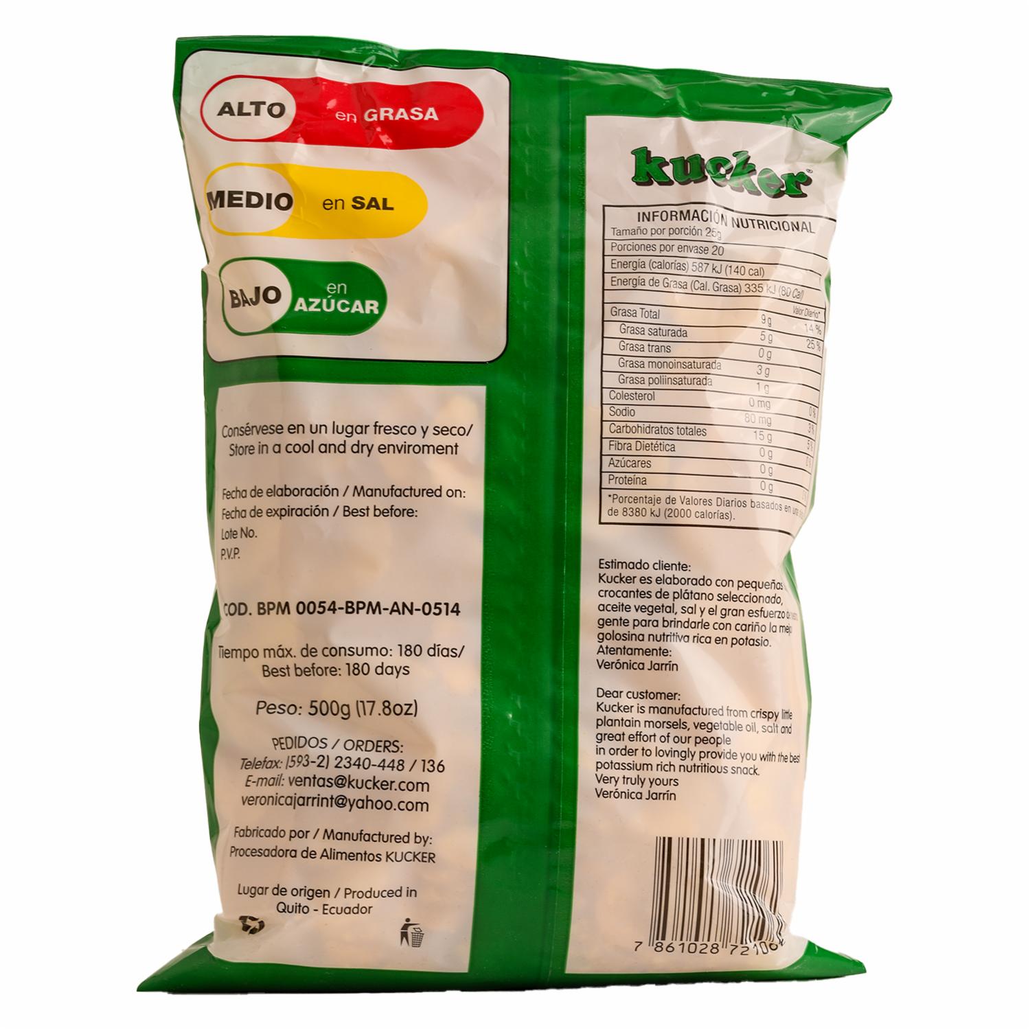 Elaborado con plátano verde, aceite vegetal y sal este producto es libre de transgénicos y libre de gluten