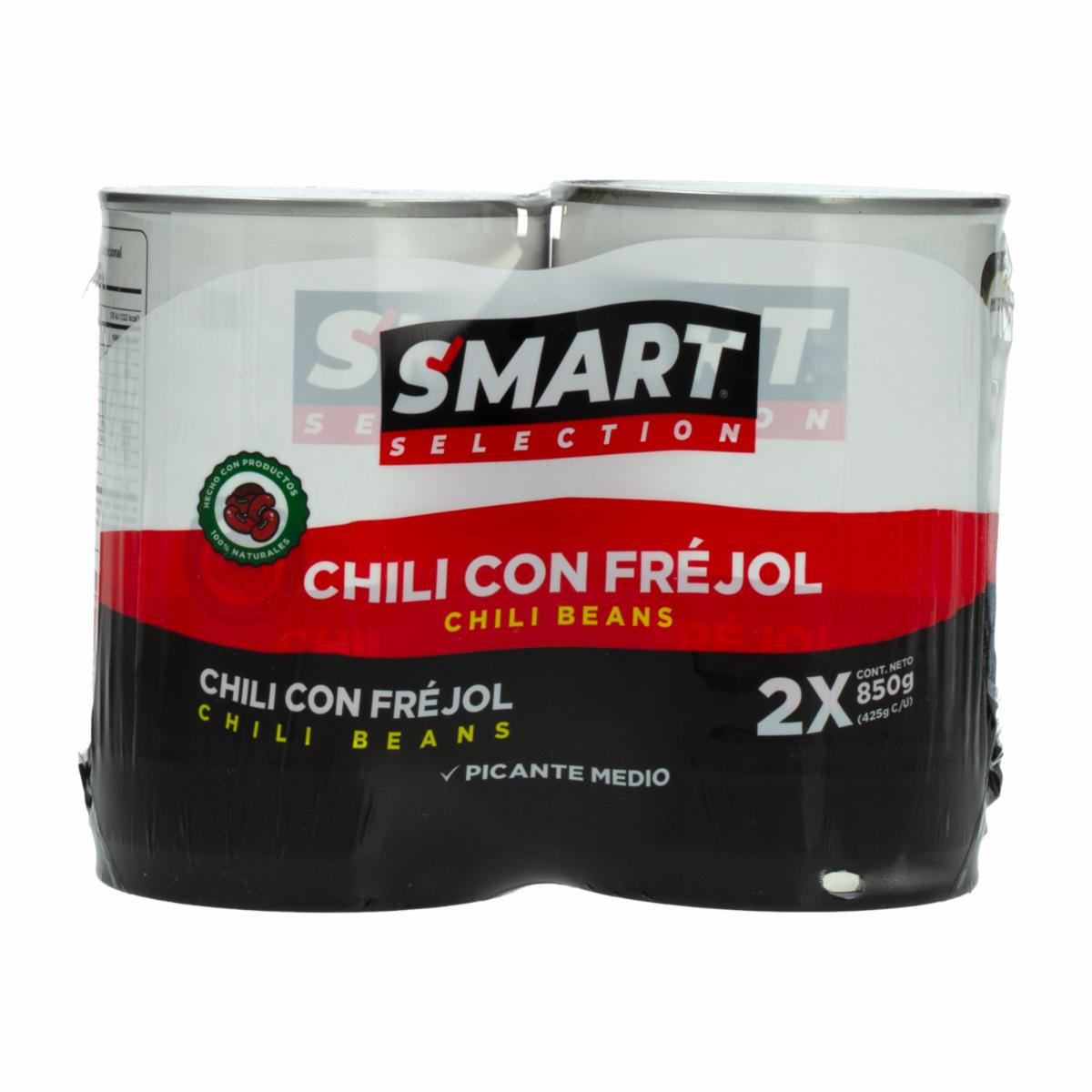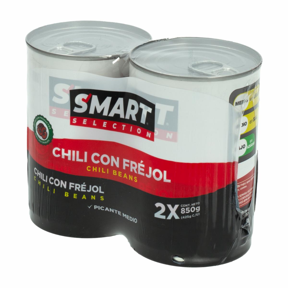 - El Chili con Frijol SMART SELECTION en presentación doble de 2x425 g es una opción práctica y deliciosa para quienes buscan un platillo lleno de sabor y fácil de preparar. Este chili está preparado con frijoles y una mezcla de especias que brindan un sabor auténtico y satisfactorio, ideal para acompañar arroz, tortillas o disfrutarlo solo como un plato principal