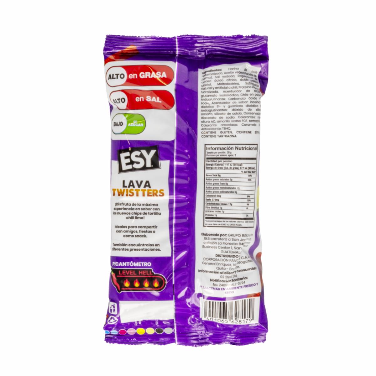 - Los chips de tortilla sabor a chili limón ESY, en presentación de 50 g, ofrecen una combinación irresistible de crujiente textura y un intenso toque picante con notas cítricas