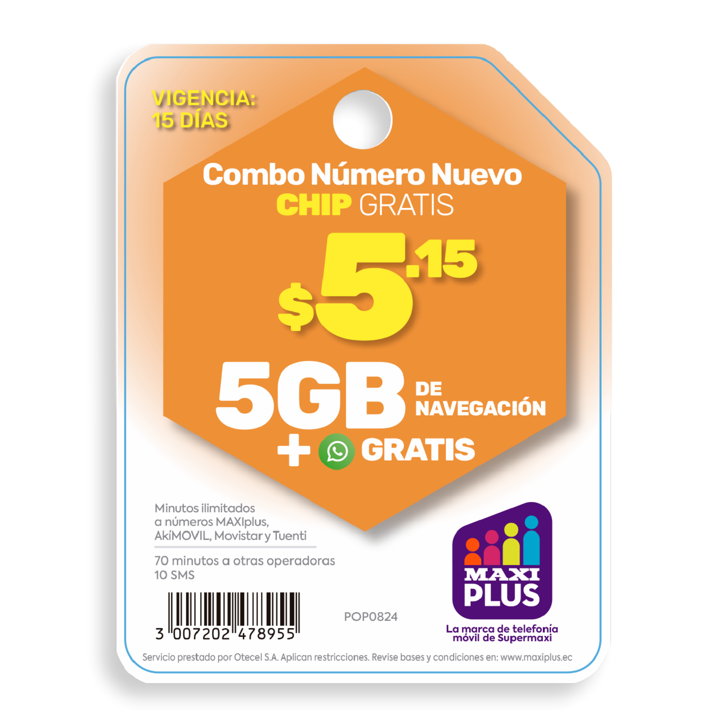 Chip Numerado 15 Días MAXIPLUS Combo – MAXIPLUS. Disponible en nuestros locales. Precio y stock pueden variar según la tienda.