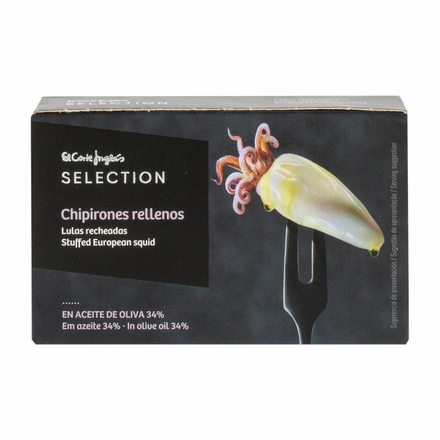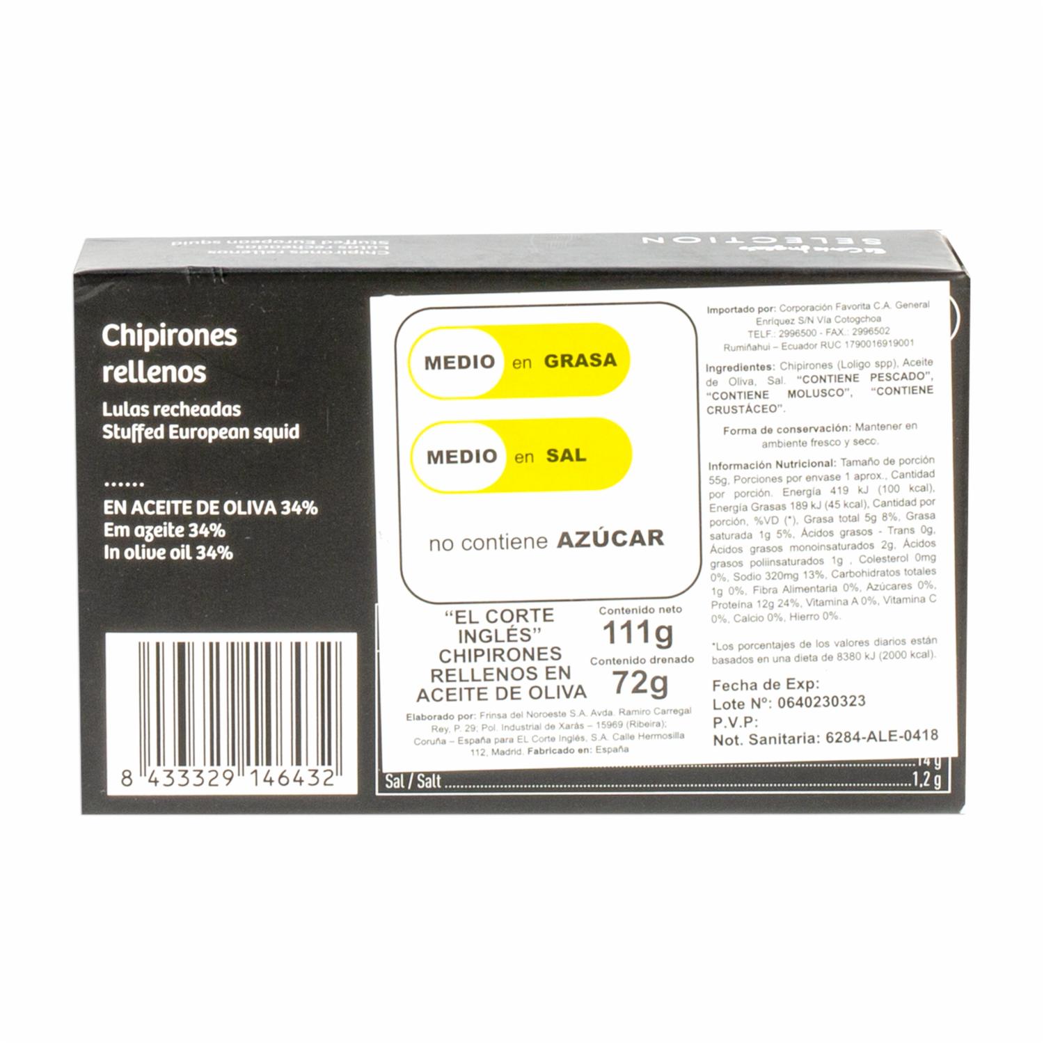 - Los chipirones en aceite de oliva de El Corte Inglés, presentados en una lata de 111 gramos, son un producto gourmet que consiste en pequeños calamares, conocidos como chipirones, preservados en aceite de oliva de alta calidad