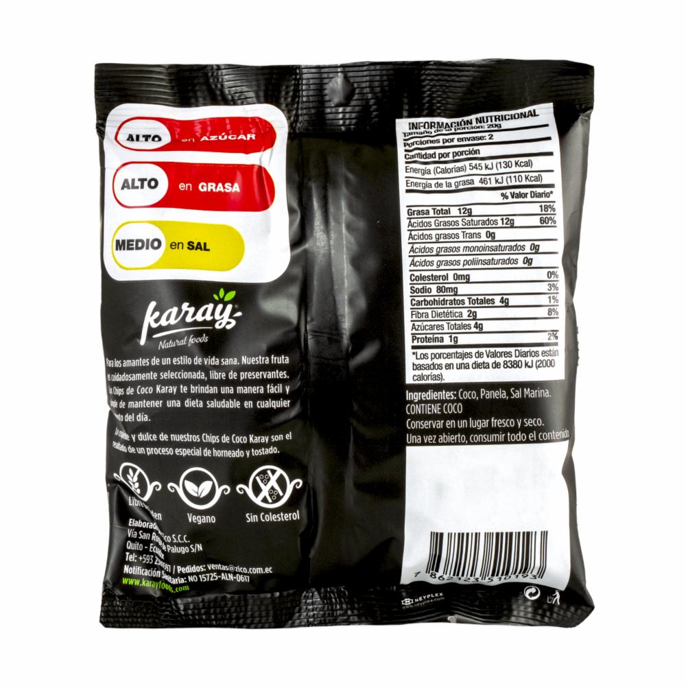 Lo crujiente y dulce de los Chips de Coco Karay son el resultado de un proceso especial de horneado. Ingredientes: Coco, panela y sal marina