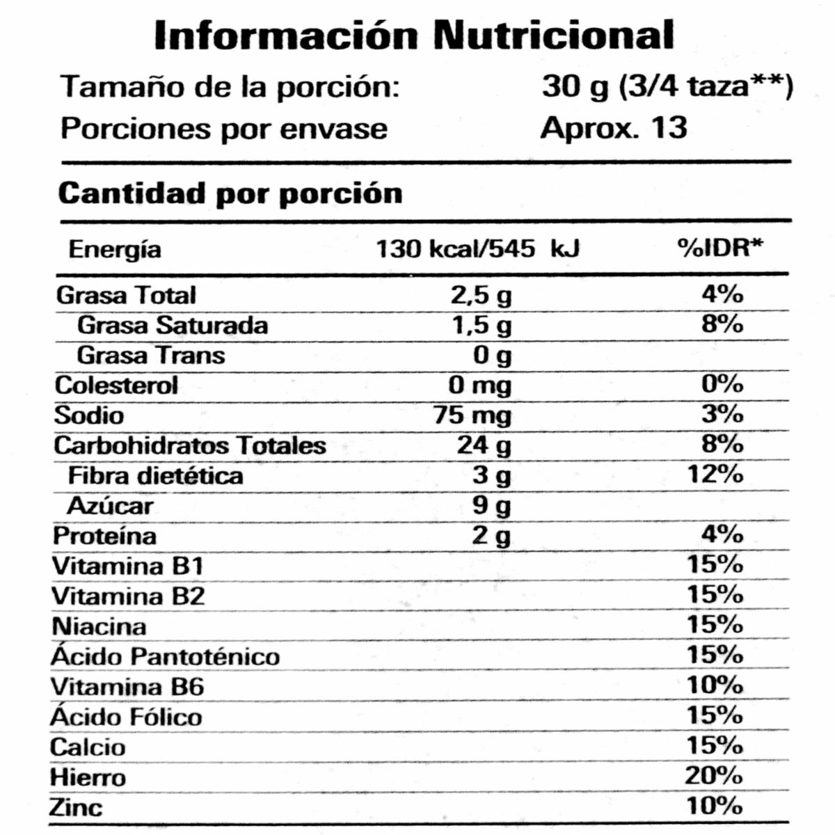 - Elaborado con cereal integral, con lo que aporta una cantidad de fibra alimentaria que contribuye al sistema digestivo, aportando energía y saciedad al mismo tiempo; todo ello acompañado del delicioso sabor a chocolate