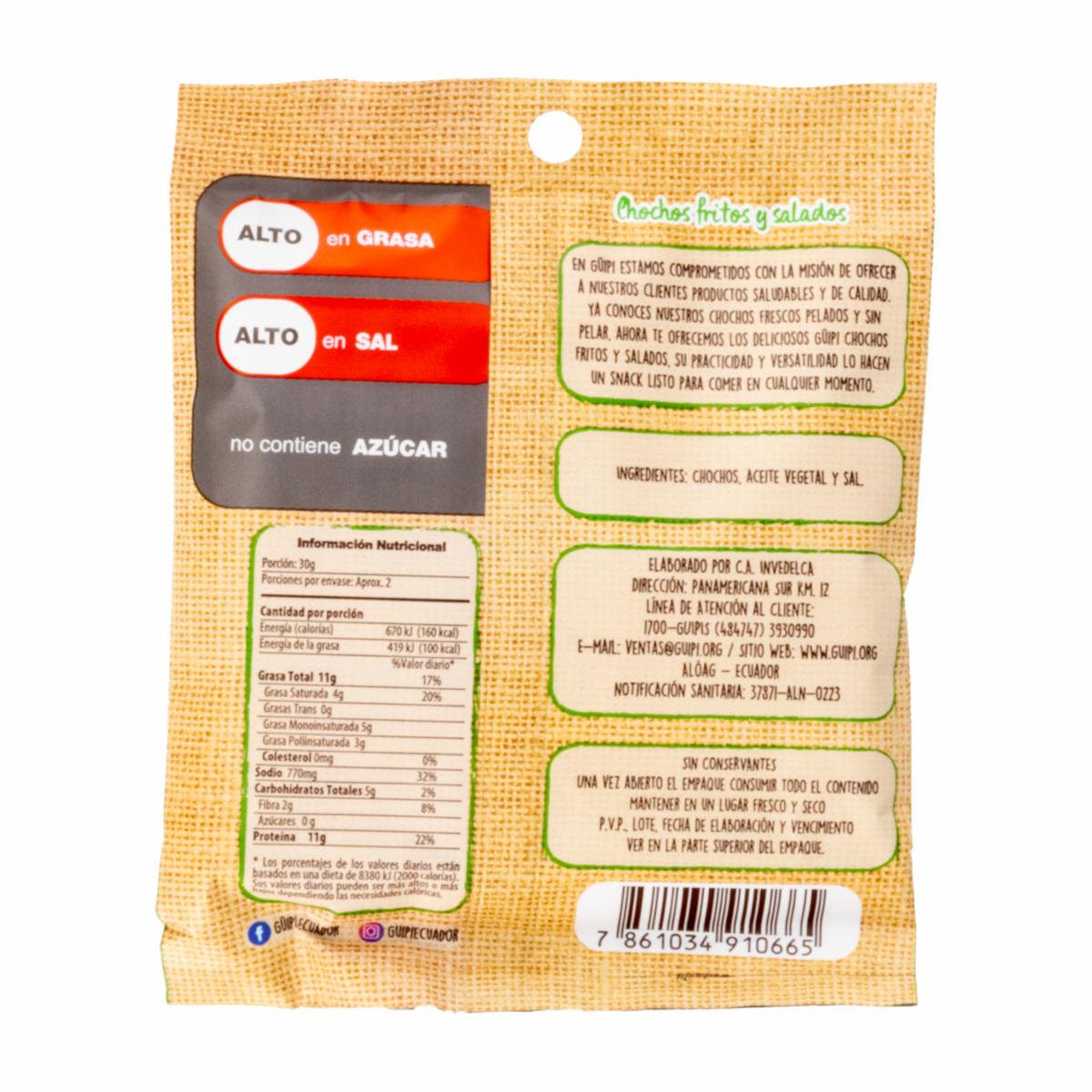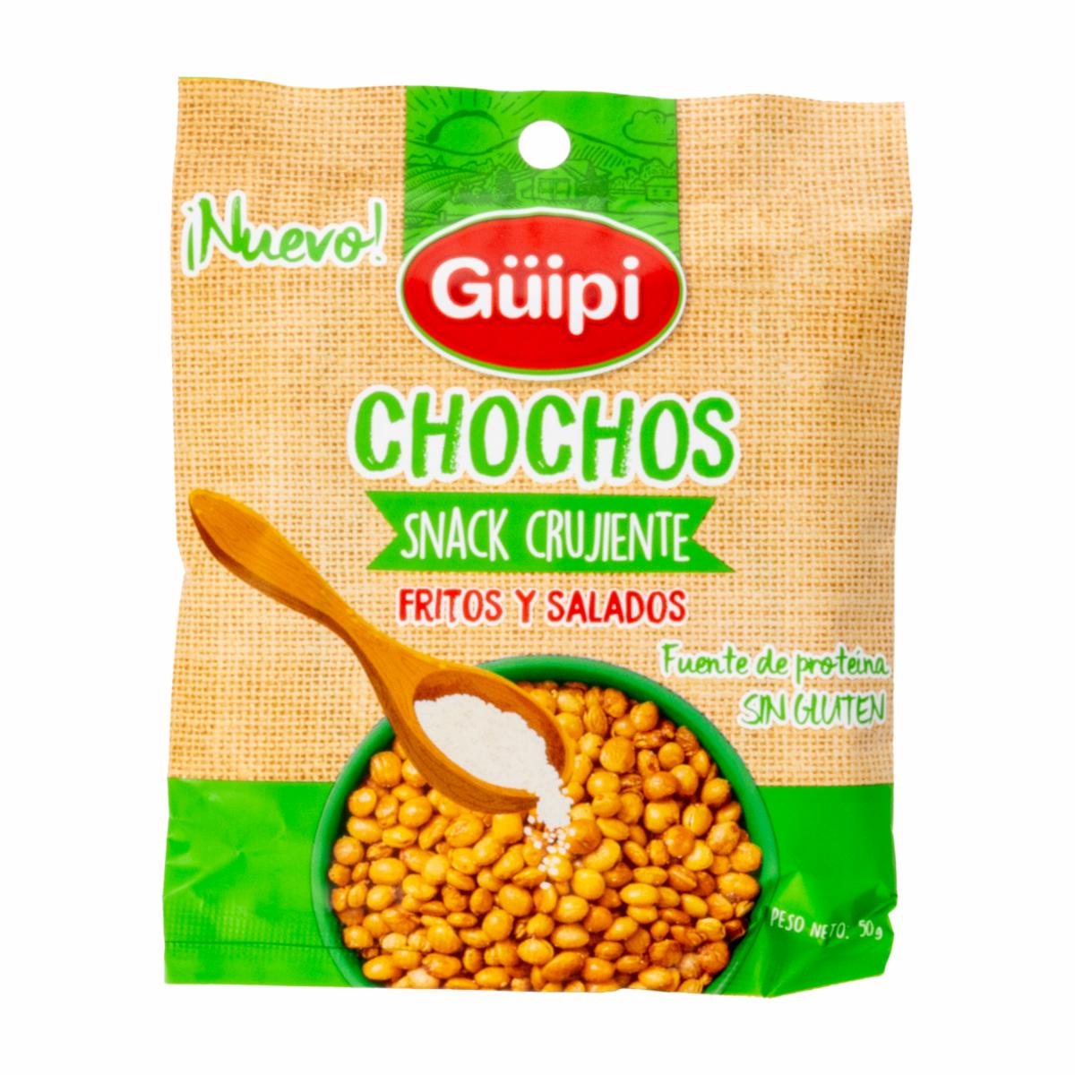 - El Chocho Frito Salado GUIPI 50 g es un snack saludable y sabroso, ideal para quienes buscan disfrutar de un aperitivo con un toque de sal. Está hecho a base de chocho (también conocido como tarwi o lupino), una legumbre rica en proteínas y fibra, que lo convierte en una opción nutritiva para picar entre comidas o como acompañante