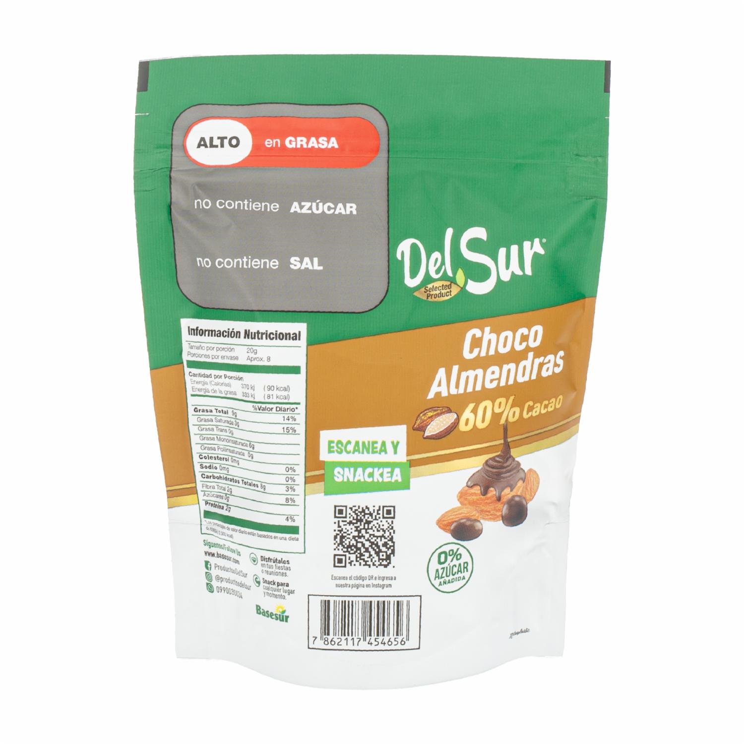 Choco Almendra 60% Cacao Sin Azúcar Añadida DEL SUR 150 G – DEL SUR. Disponible en nuestros locales. Precio y stock pueden variar según la tienda.