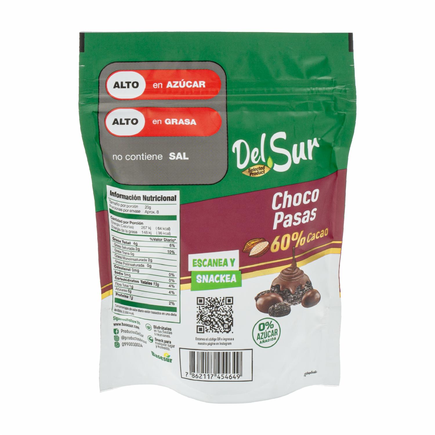 Choco pasas 60% Cacao Sin Azúcar Añadida DEL SUR 150 G – DEL SUR. Disponible en nuestros locales. Precio y stock pueden variar según la tienda.