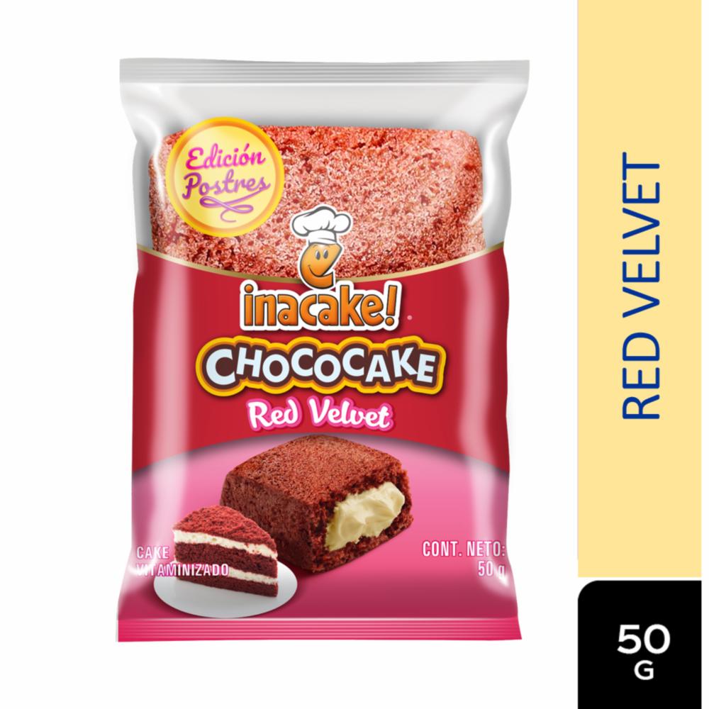 • El "Chococake de Red Velvet Inacake 50 g" es un pastelito o bizcocho con sabor a "Red Velvet", que es una variedad de pastel conocida por su característico color rojo oscuro y su sabor a chocolate con un toque agridulce