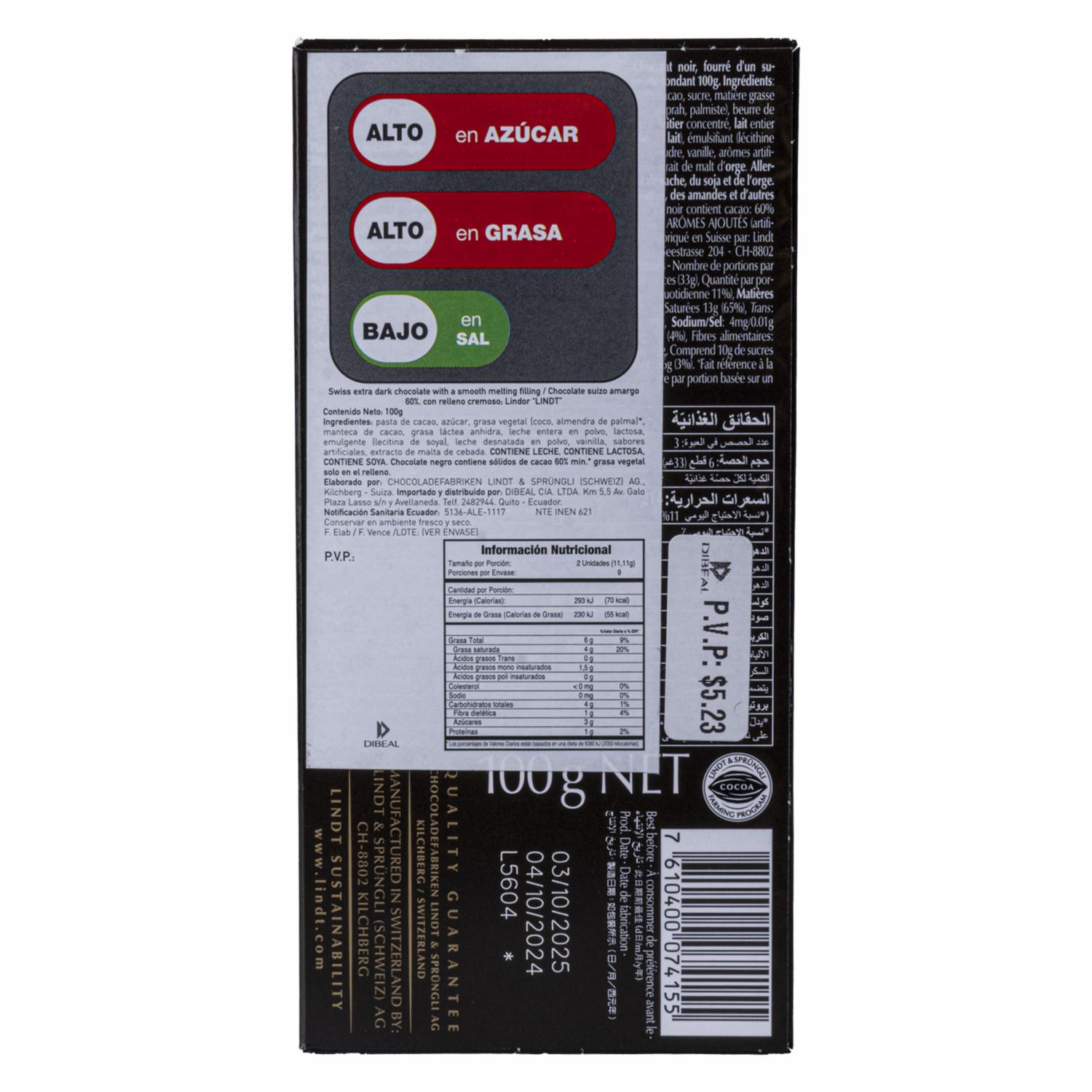 Chocolate 0,6 Extra Dark LINDT 100 g – LINDT. Disponible en nuestros locales. Precio y stock pueden variar según la tienda.