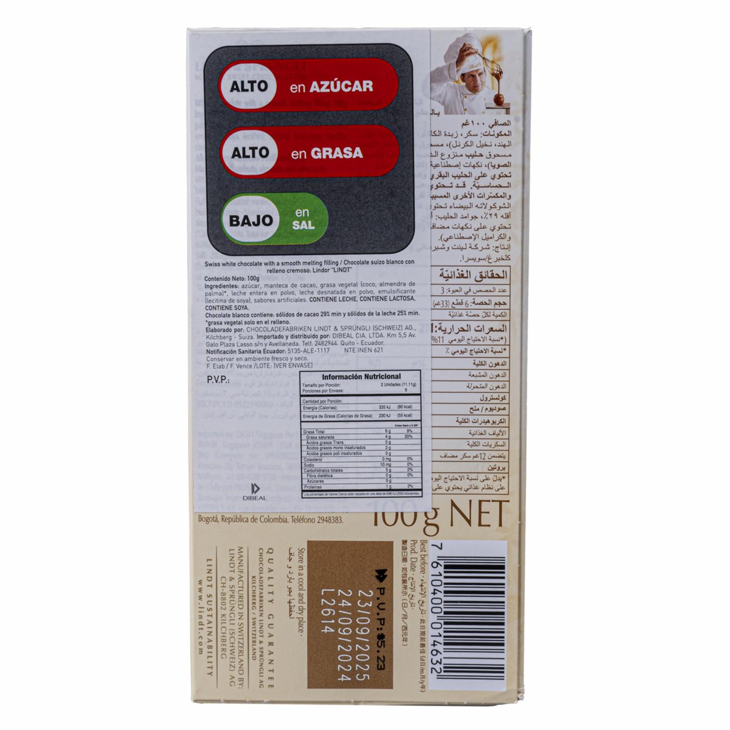 consultando preciosChocolate Blanco LINDT 100 g – LINDT. Disponible en nuestros locales. Precio y stock pueden variar según la tienda.