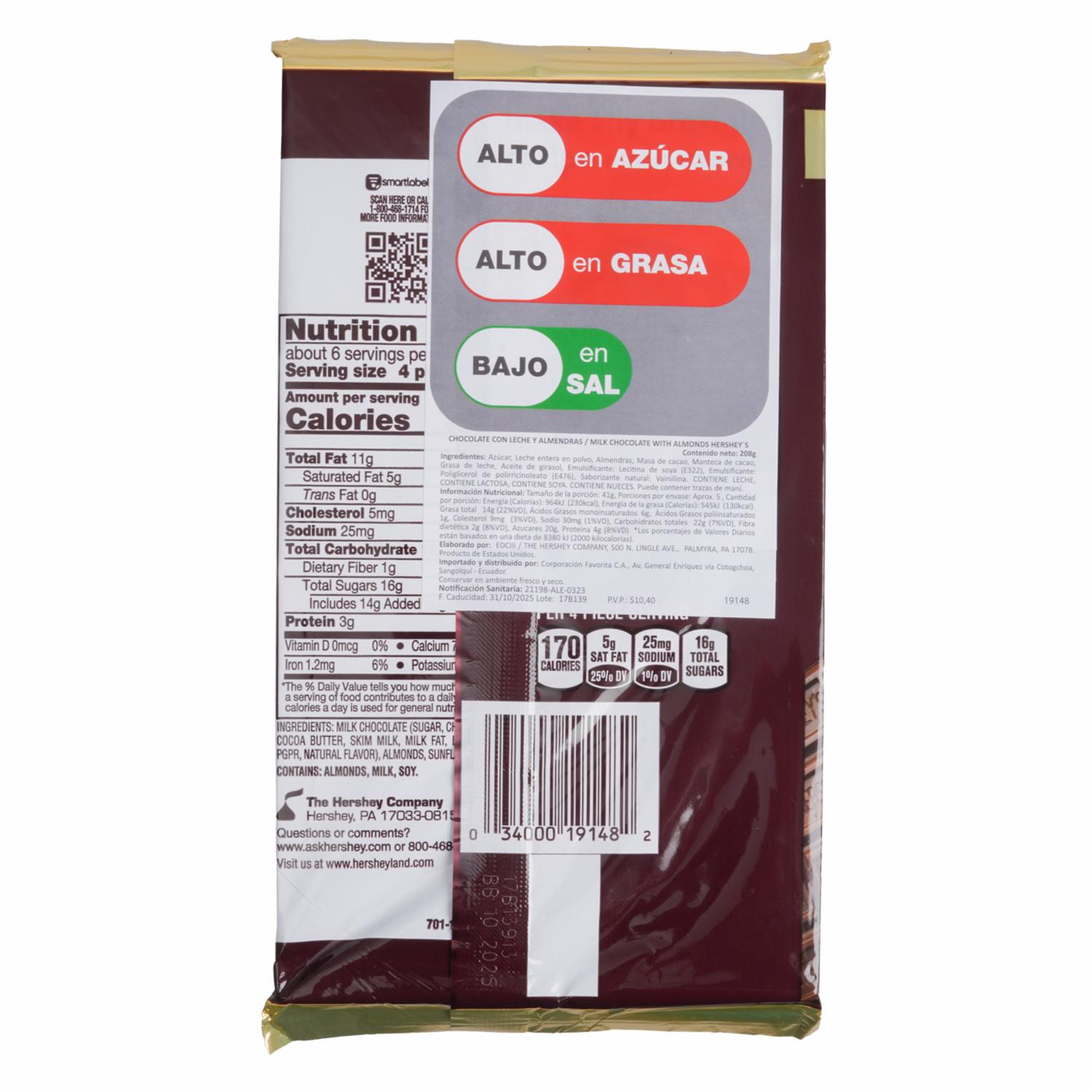 Chocolate Con Almendras HERSHEY’S 208 G – HERSHEY´S. Disponible en nuestros locales. Precio y stock pueden variar según la tienda.