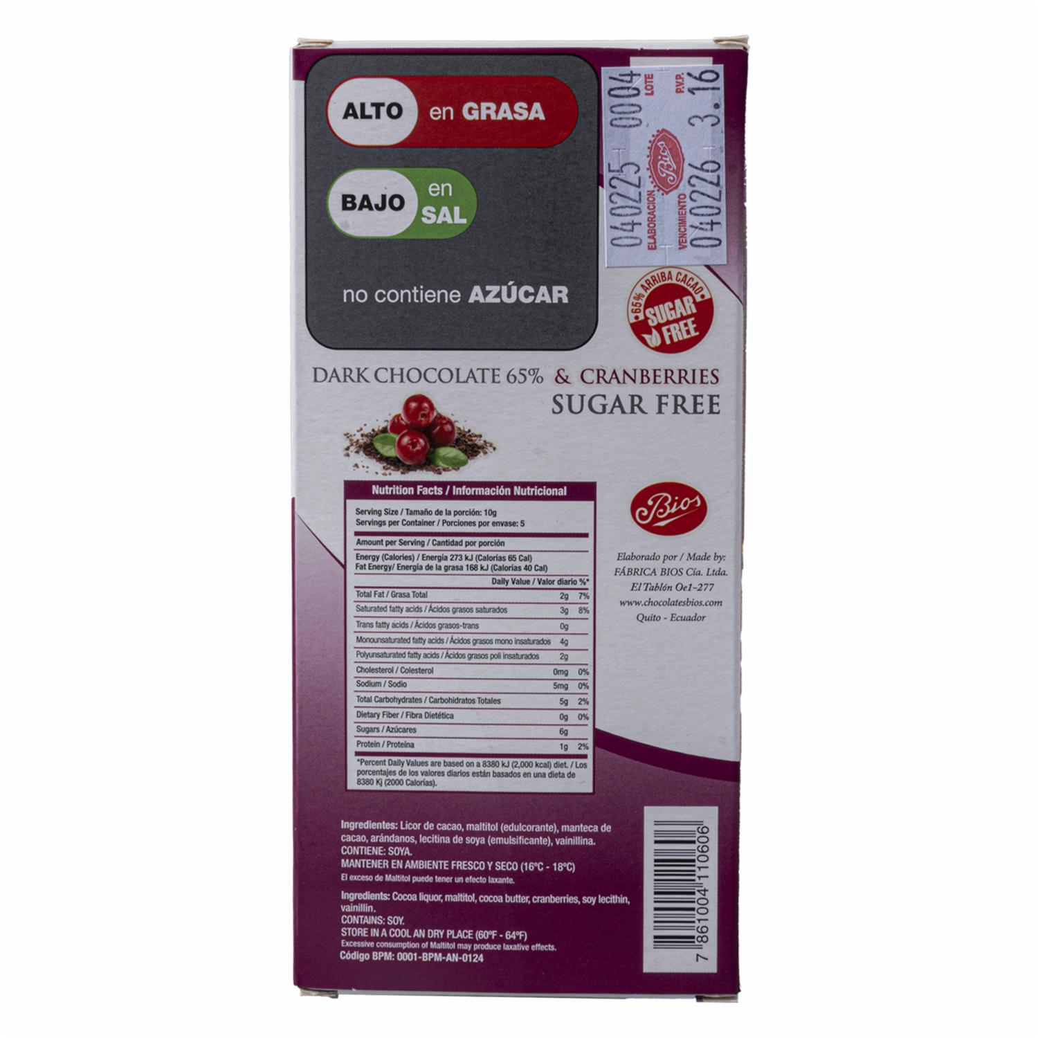 Chocolate Con Arándanos Sin Azúcar BIOS 50 G