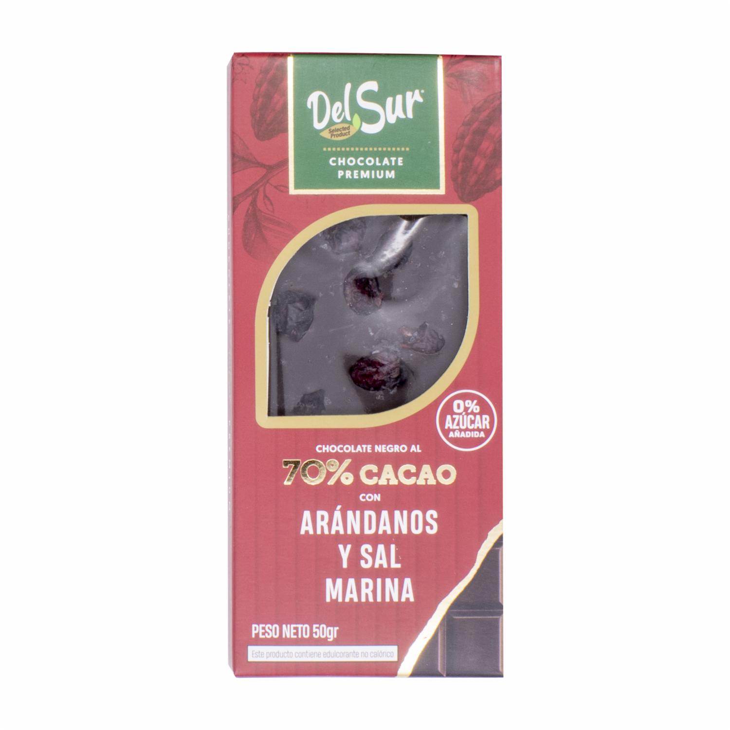 - El "Chocolate con Arándanos y Sal Rosada" de la marca DEL SUR es un producto que combina la dulzura del chocolate con la acidez de los arándanos y un toque de sal rosada. Esta combinación de sabores crea una experiencia de sabor equilibrada y deliciosa