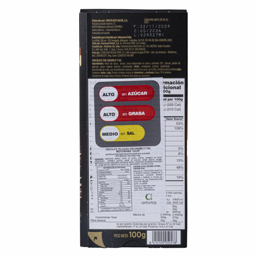 consultando preciosChocolate Con Caramelo Y Sal Mediterránea VALOR 100 G – VALOR. Disponible en nuestros locales. Precio y stock pueden variar según la tienda.