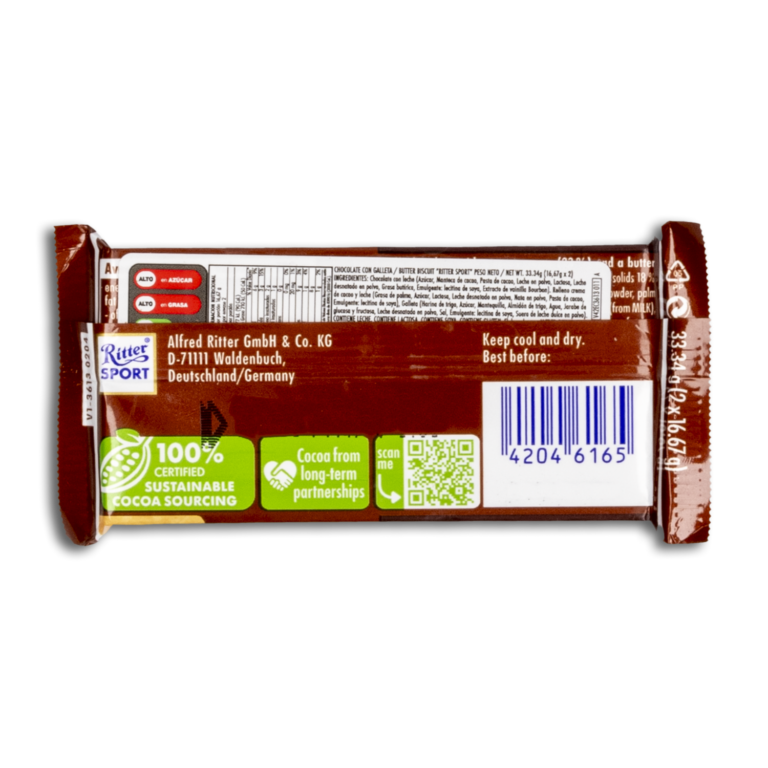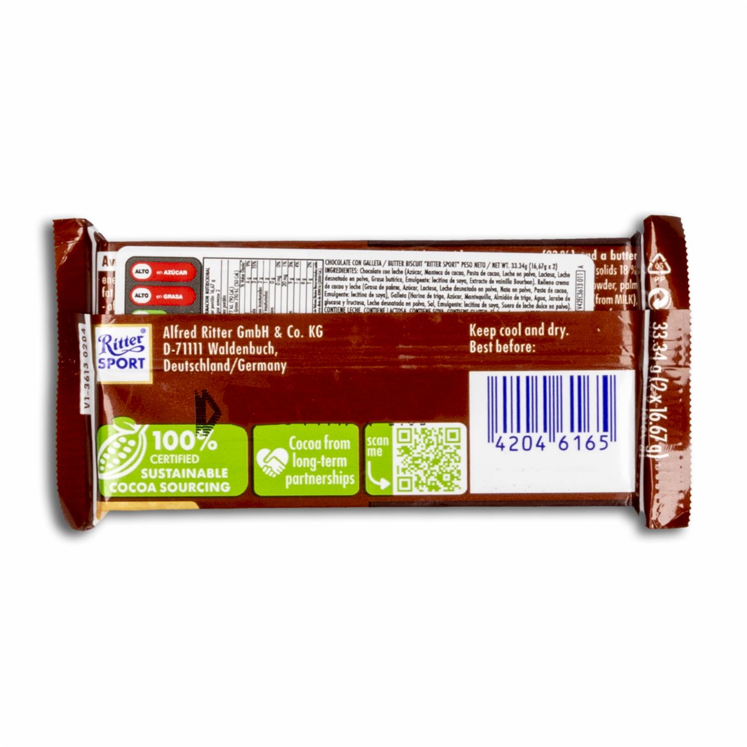 - Deléitate con el exquisito chocolate con galleta de RITTER. Este delicioso snack de 33.34 g combina la suavidad del chocolate con el crujiente de la galleta, creando una experiencia de sabor irresistible. Ideal para esos momentos en que buscas un pequeño placer, ya sea en casa, en la oficina o mientras viajas