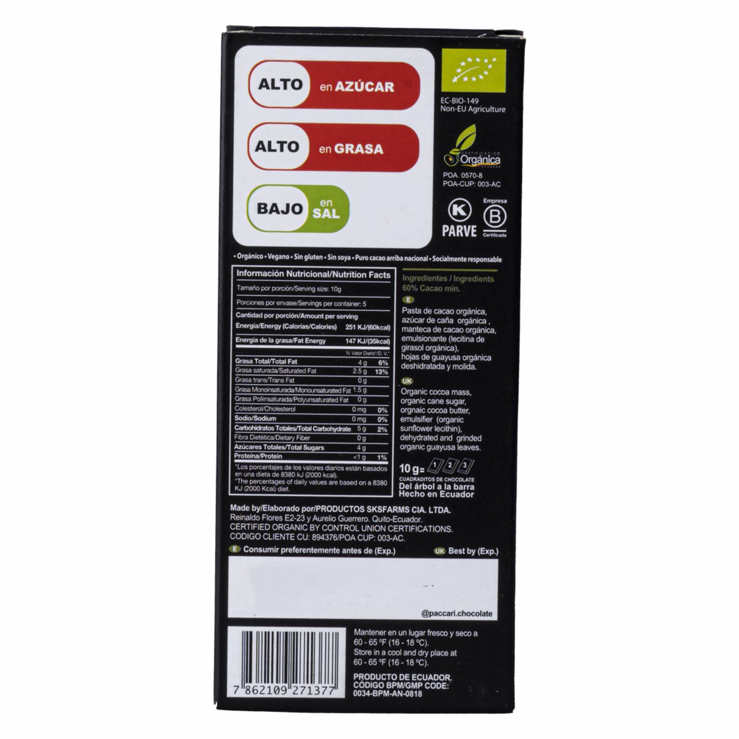 Chocolate Con Guayusa Orgánicp PACCARI Tableta