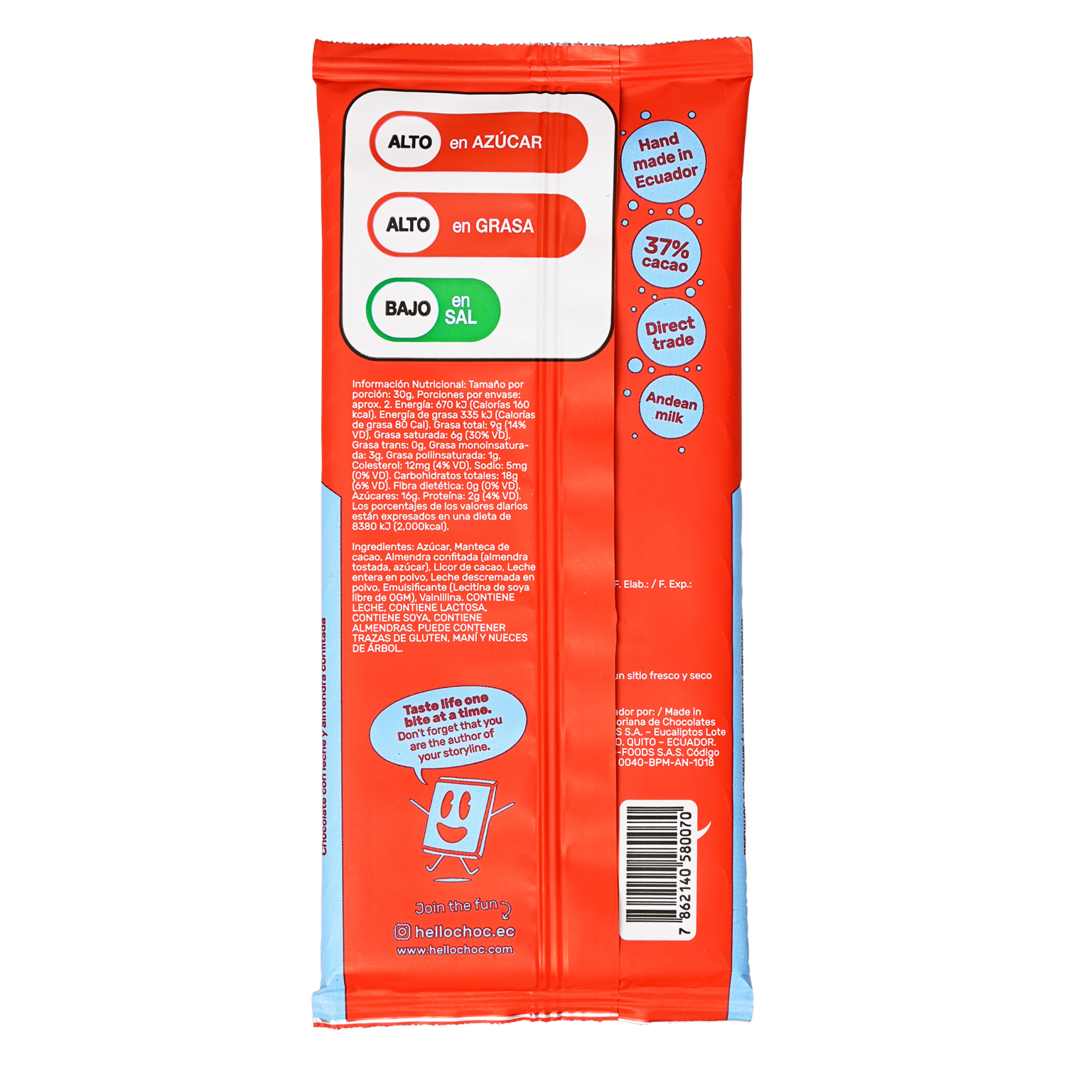 - Dejate tentar por la combinación perfecta de cremoso chocolate con leche y crujientes almendras que HELLO CHOC tiene para vos. Cada tableta es una experiencia de sabor que derrite el estrés y despierta tu lado más dulce. Ideal para un snack rápido, un detalle para compartir o ese momento de indulgencia que te merecés
