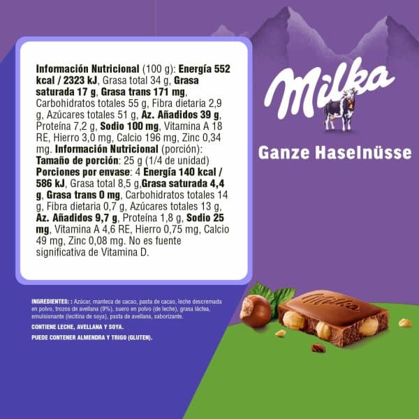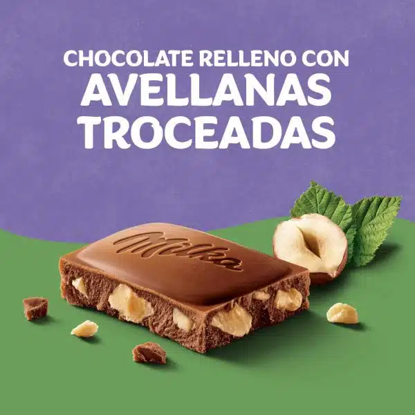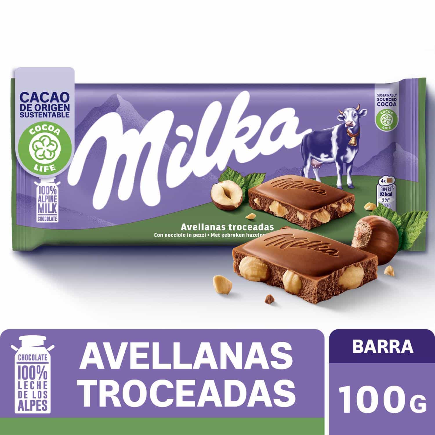 Chocolate Milka relleno con Avellanas troceadas es un suave y cremoso chocolate que se derrite en la boca, relleno con trozos de avellanas. Cada tableta contiene 100 g. Desde su creación en Suiza en 1901, Milka ha mantenido su promesa original, ser un chocolate de alta calidad, suave, cremoso y hecho 100% con autentica leche de los Alpes. Perfecto para disfrutar en familia y regalonear a los que más quieres. También disfrútalos mientras te das una pausa en tu rutina diaria o para consentirte